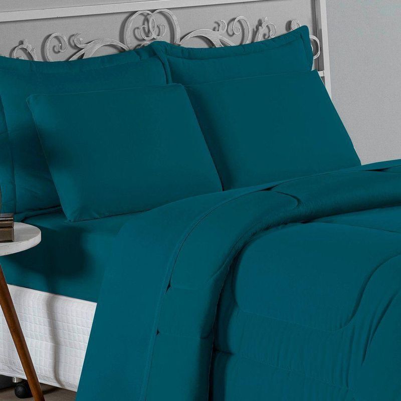 Kit Edredom Dupla Face + Jogo De Lençol Solteiro Nobre 5 Peças Malha 100% Algodão - PetróleoGaranta a experiência completa de conforto e decoração com o Kit Cama Completa Solteiro Nobre 5 Peças. Este conjunto premium inclui todas as peças necessárias para vestir a cama, do lençol de cima ao edredom, tudo em malha 100% algodão.Por que este Kit é uma ótima escolha?- Enxoval Completo: Diferente dos kits básicos, este modelo inclui o Lençol de Cima, ideal para dias frescos e para proteger o edredom, garantindo higiene e conforto térmico.- Qualidade da Malha: Feito em 100% Algodão Fio 30/1 Penteado, oferece toque macio, não dá bolinhas e é altamente respirável.- Decoração Impecável: O edredom dupla face e o porta travesseiro matelado decoram a cama, enquanto o jogo de lençóis completo traz a sensação de cama de hotel.- Ajuste Seguro: O lençol de baixo com elástico fixa-se firmemente ao colchão solteiro.Produto composto por (Total 05 Peças):Do Kit Edredom (02 Peças):01 Edredom Solteiro Dupla Face: 1,60m x 2,40m01 Porta Travesseiro Matelado: 50cm x 70cmDo Jogo de Lençol (03 Peças):01 Lençol de Cima (Virol): 1,60m x 2,40m01 Lençol de Baixo com Elástico: 1,88m x 88cm x 30cm01 Fronha: 70cm x 50cmComposição:Tecido (Todas as peças): Malha 100% Algodão - Fio 30/1 PenteadoEnchimento (Edredom e Porta Travesseiro): 100% Poliéster (Edredom com fibra siliconada)Forro (Apenas Porta Travesseiro): 100% Polipropileno