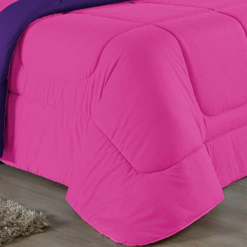 Kit Edredom Dupla Face + Jogo De Lençol Solteiro Nobre 5 Peças Malha 100% Algodão - Pink / RoxoGaranta a experiência completa de conforto e decoração com o Kit Cama Completa Solteiro Nobre 5 Peças. Este conjunto premium inclui todas as peças necessárias para vestir a cama, do lençol de cima ao edredom, tudo em malha 100% algodão.Por que este Kit é uma ótima escolha?- Enxoval Completo: Diferente dos kits básicos, este modelo inclui o Lençol de Cima, ideal para dias frescos e para proteger o edredom, garantindo higiene e conforto térmico.- Qualidade da Malha: Feito em 100% Algodão Fio 30/1 Penteado, oferece toque macio, não dá bolinhas e é altamente respirável.- Decoração Impecável: O edredom dupla face e o porta travesseiro matelado decoram a cama, enquanto o jogo de lençóis completo traz a sensação de cama de hotel.- Ajuste Seguro: O lençol de baixo com elástico fixa-se firmemente ao colchão solteiro.Produto composto por (Total 05 Peças):Do Kit Edredom (02 Peças):01 Edredom Solteiro Dupla Face: 1,60m x 2,40m01 Porta Travesseiro Matelado: 50cm x 70cmDo Jogo de Lençol (03 Peças):01 Lençol de Cima (Virol): 1,60m x 2,40m01 Lençol de Baixo com Elástico: 1,88m x 88cm x 30cm01 Fronha: 70cm x 50cmComposição:Tecido (Todas as peças): Malha 100% Algodão - Fio 30/1 PenteadoEnchimento (Edredom e Porta Travesseiro): 100% Poliéster (Edredom com fibra siliconada)Forro (Apenas Porta Travesseiro): 100% Polipropileno