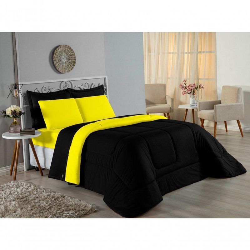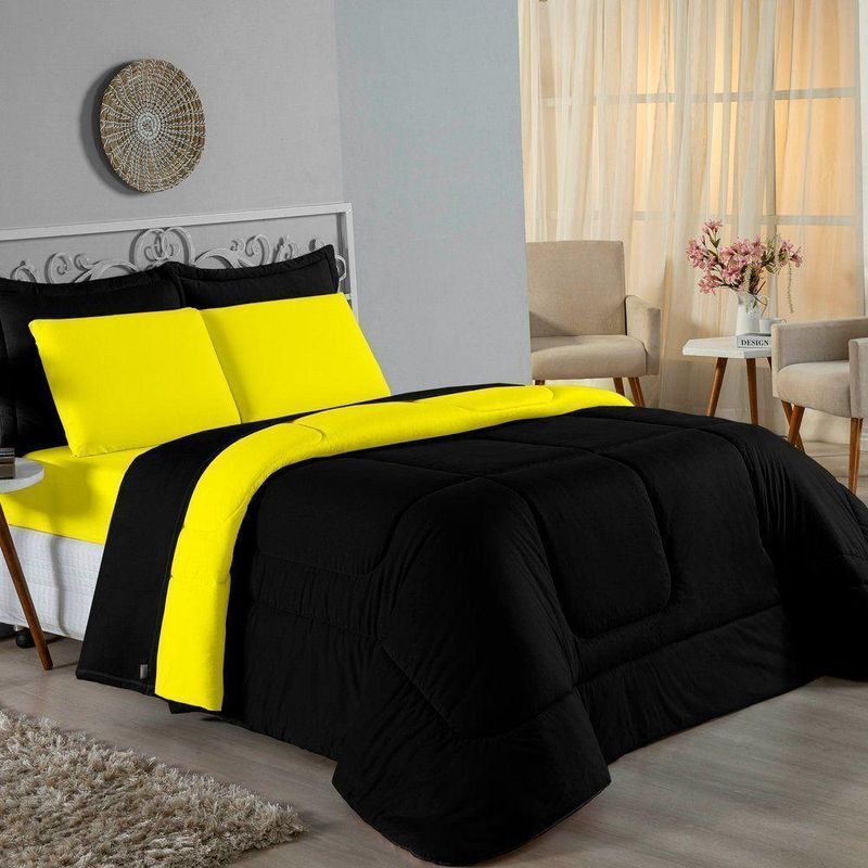 Kit Edredom Dupla Face + Jogo De Lençol Solteiro Nobre 5 Peças Malha 100% Algodão - Preto / AmareloGaranta a experiência completa de conforto e decoração com o Kit Cama Completa Solteiro Nobre 5 Peças. Este conjunto premium inclui todas as peças necessárias para vestir a cama, do lençol de cima ao edredom, tudo em malha 100% algodão.Por que este Kit é uma ótima escolha?- Enxoval Completo: Diferente dos kits básicos, este modelo inclui o Lençol de Cima, ideal para dias frescos e para proteger o edredom, garantindo higiene e conforto térmico.- Qualidade da Malha: Feito em 100% Algodão Fio 30/1 Penteado, oferece toque macio, não dá bolinhas e é altamente respirável.- Decoração Impecável: O edredom dupla face e o porta travesseiro matelado decoram a cama, enquanto o jogo de lençóis completo traz a sensação de cama de hotel.- Ajuste Seguro: O lençol de baixo com elástico fixa-se firmemente ao colchão solteiro.Produto composto por (Total 05 Peças):Do Kit Edredom (02 Peças):01 Edredom Solteiro Dupla Face: 1,60m x 2,40m01 Porta Travesseiro Matelado: 50cm x 70cmDo Jogo de Lençol (03 Peças):01 Lençol de Cima (Virol): 1,60m x 2,40m01 Lençol de Baixo com Elástico: 1,88m x 88cm x 30cm01 Fronha: 70cm x 50cmComposição:Tecido (Todas as peças): Malha 100% Algodão - Fio 30/1 PenteadoEnchimento (Edredom e Porta Travesseiro): 100% Poliéster (Edredom com fibra siliconada)Forro (Apenas Porta Travesseiro): 100% Polipropileno