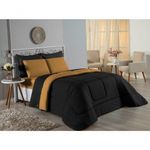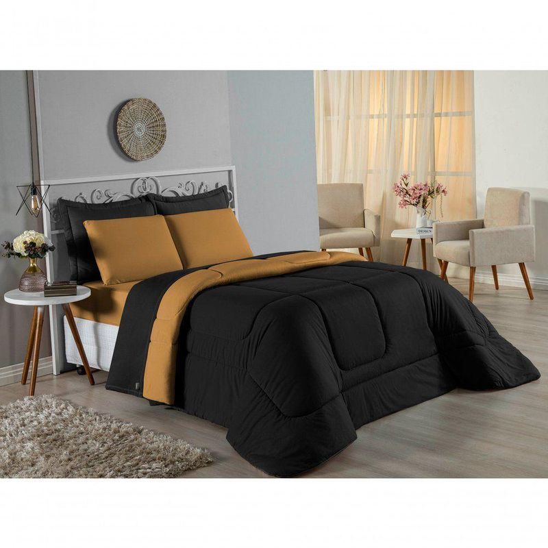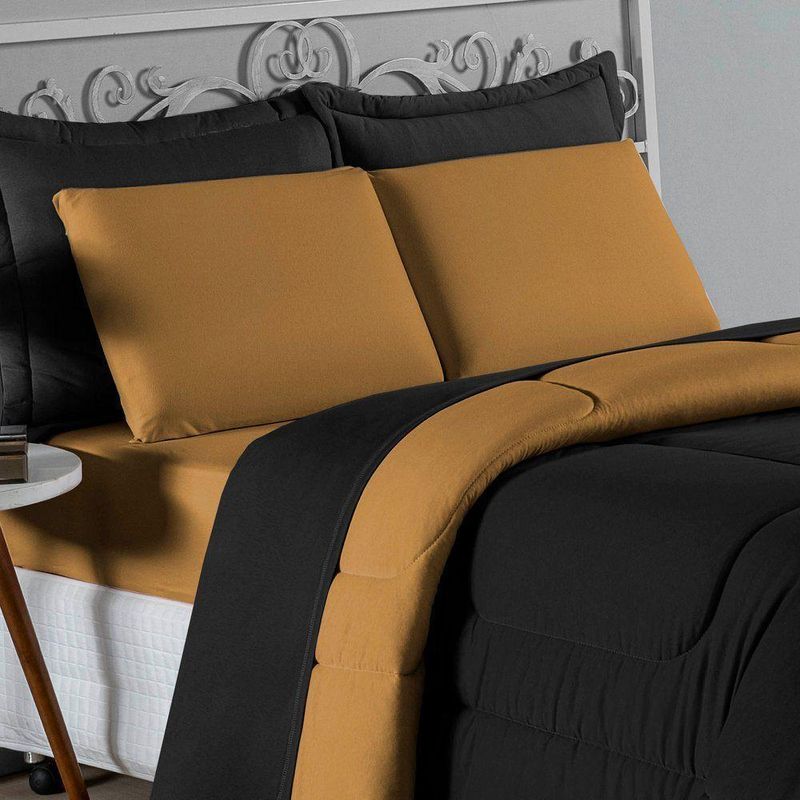 Kit Edredom Dupla Face + Jogo De Lençol Solteiro Nobre 5 Peças Malha 100% Algodão - Preto / CobreGaranta a experiência completa de conforto e decoração com o Kit Cama Completa Solteiro Nobre 5 Peças. Este conjunto premium inclui todas as peças necessárias para vestir a cama, do lençol de cima ao edredom, tudo em malha 100% algodão.Por que este Kit é uma ótima escolha?- Enxoval Completo: Diferente dos kits básicos, este modelo inclui o Lençol de Cima, ideal para dias frescos e para proteger o edredom, garantindo higiene e conforto térmico.- Qualidade da Malha: Feito em 100% Algodão Fio 30/1 Penteado, oferece toque macio, não dá bolinhas e é altamente respirável.- Decoração Impecável: O edredom dupla face e o porta travesseiro matelado decoram a cama, enquanto o jogo de lençóis completo traz a sensação de cama de hotel.- Ajuste Seguro: O lençol de baixo com elástico fixa-se firmemente ao colchão solteiro.Produto composto por (Total 05 Peças):Do Kit Edredom (02 Peças):01 Edredom Solteiro Dupla Face: 1,60m x 2,40m01 Porta Travesseiro Matelado: 50cm x 70cmDo Jogo de Lençol (03 Peças):01 Lençol de Cima (Virol): 1,60m x 2,40m01 Lençol de Baixo com Elástico: 1,88m x 88cm x 30cm01 Fronha: 70cm x 50cmComposição:Tecido (Todas as peças): Malha 100% Algodão - Fio 30/1 PenteadoEnchimento (Edredom e Porta Travesseiro): 100% Poliéster (Edredom com fibra siliconada)Forro (Apenas Porta Travesseiro): 100% Polipropileno