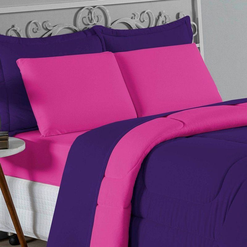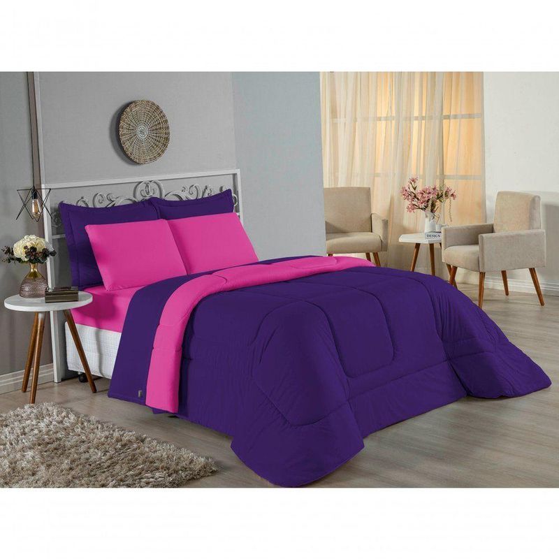 Kit Edredom Dupla Face + Jogo De Lençol Solteiro Nobre 5 Peças Malha 100% Algodão - Roxo / PinkGaranta a experiência completa de conforto e decoração com o Kit Cama Completa Solteiro Nobre 5 Peças. Este conjunto premium inclui todas as peças necessárias para vestir a cama, do lençol de cima ao edredom, tudo em malha 100% algodão.Por que este Kit é uma ótima escolha?- Enxoval Completo: Diferente dos kits básicos, este modelo inclui o Lençol de Cima, ideal para dias frescos e para proteger o edredom, garantindo higiene e conforto térmico.- Qualidade da Malha: Feito em 100% Algodão Fio 30/1 Penteado, oferece toque macio, não dá bolinhas e é altamente respirável.- Decoração Impecável: O edredom dupla face e o porta travesseiro matelado decoram a cama, enquanto o jogo de lençóis completo traz a sensação de cama de hotel.- Ajuste Seguro: O lençol de baixo com elástico fixa-se firmemente ao colchão solteiro.Produto composto por (Total 05 Peças):Do Kit Edredom (02 Peças):01 Edredom Solteiro Dupla Face: 1,60m x 2,40m01 Porta Travesseiro Matelado: 50cm x 70cmDo Jogo de Lençol (03 Peças):01 Lençol de Cima (Virol): 1,60m x 2,40m01 Lençol de Baixo com Elástico: 1,88m x 88cm x 30cm01 Fronha: 70cm x 50cmComposição:Tecido (Todas as peças): Malha 100% Algodão - Fio 30/1 PenteadoEnchimento (Edredom e Porta Travesseiro): 100% Poliéster (Edredom com fibra siliconada)Forro (Apenas Porta Travesseiro): 100% Polipropileno