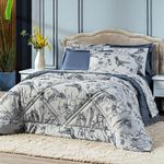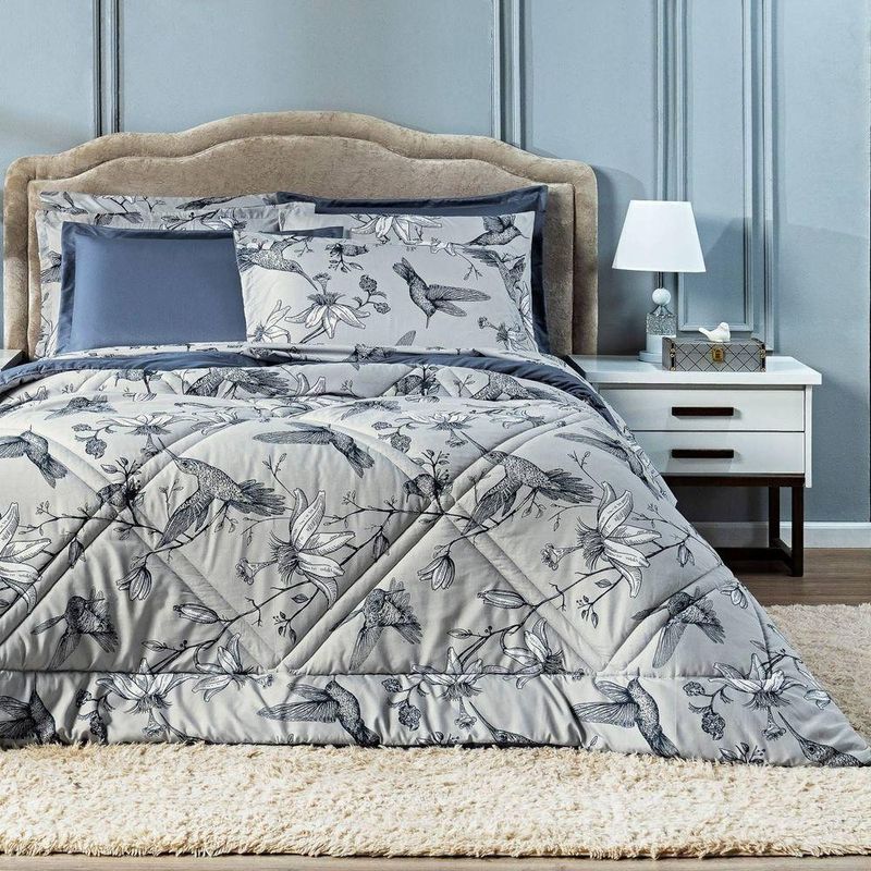 Kit Edredom Estampado Queen Beija-flor Azul/cinza Dupla Face Com Fronhas 03 Peças - Percal Soft 300 Fios AcetinadoTransforme suas noites em uma experiência de conforto e estilo com o nosso Kit Edredom Beija-flor. Este conjunto irá transformar o seu quarto em um refúgio de tranquilidade e elegância. Feito com tecido em percal de 300 fios acetinado, este edredom é luxuosamente macio ao toque, proporcionando uma sensação de abraço aconchegante. Seu design dupla face oferece versatilidade, permitindo que você mude a decoração do seu ambiente com apenas um movimento. De um lado, um belo padrão de beija-flores em tons de azul e cinza, e do outro, uma elegante tonalidade sólida em azul petróleo liso, garantindo que seu quarto esteja sempre na moda. Além disso, o conjunto inclui dois porta travesseiros estampados combinando, completando o visual harmonioso do seu espaço de descanso. A estampa delicada de beija-flores traz um toque de natureza e serenidade ao seu ambiente, enquanto os tons suaves de azul e cinza adicionam sofisticação e tranquilidade. Prepare-se para noites de sono revigorantes e sonhos tranquilos com este kit. Transforme seu quarto em um santuário de conforto e beleza, onde você pode relaxar e recarregar suas energias. Confira!Contém:01 Edredom Casal Queen 2,60m x 2,50m 02 Porta Travesseiros Estampados com Debrum 70cm x 50cm OBS: Jogo de Lençol Vendido Separadamente.Composição Edredom:Tecido Estampado: Percal 300 Fios Acetinado 100% Poliéster Tecido Liso: Percal 300 Fios Acetinado 100% PoliésterEnchimento: 100% poliésterInstruções de Uso e Lavagem:Vide etiqueta do produto.Atenção:Foto meramente ilustrativa.Variação das cores podem ocorrer de acordo com o monitor.