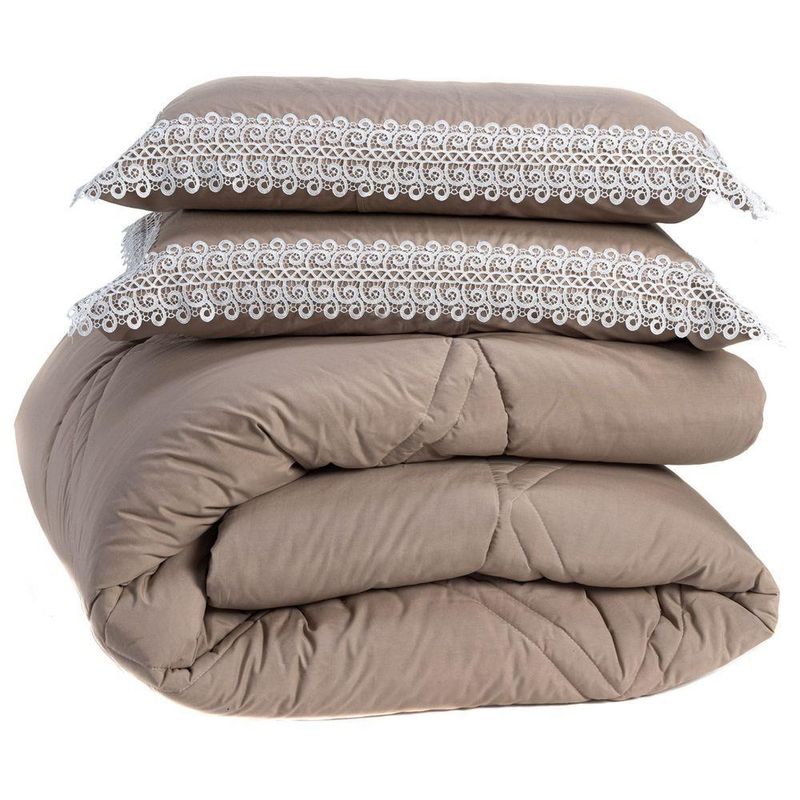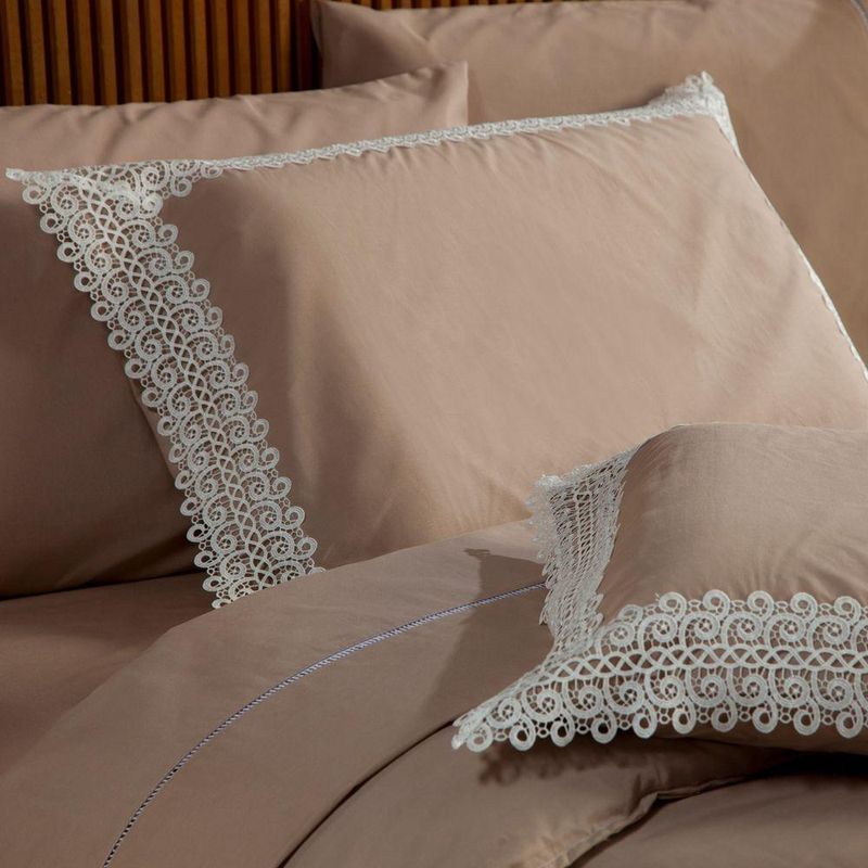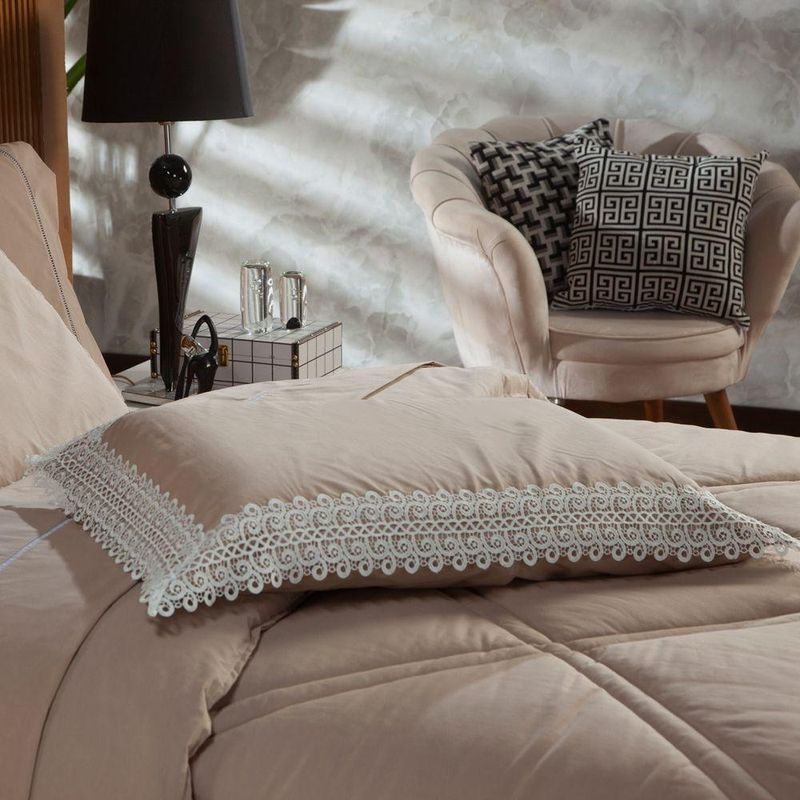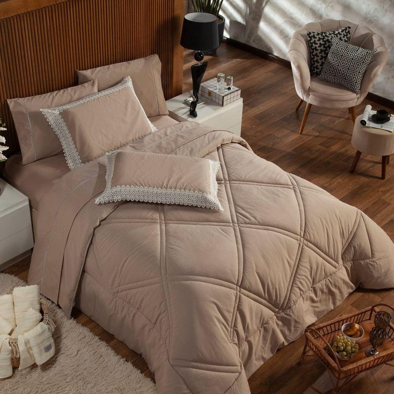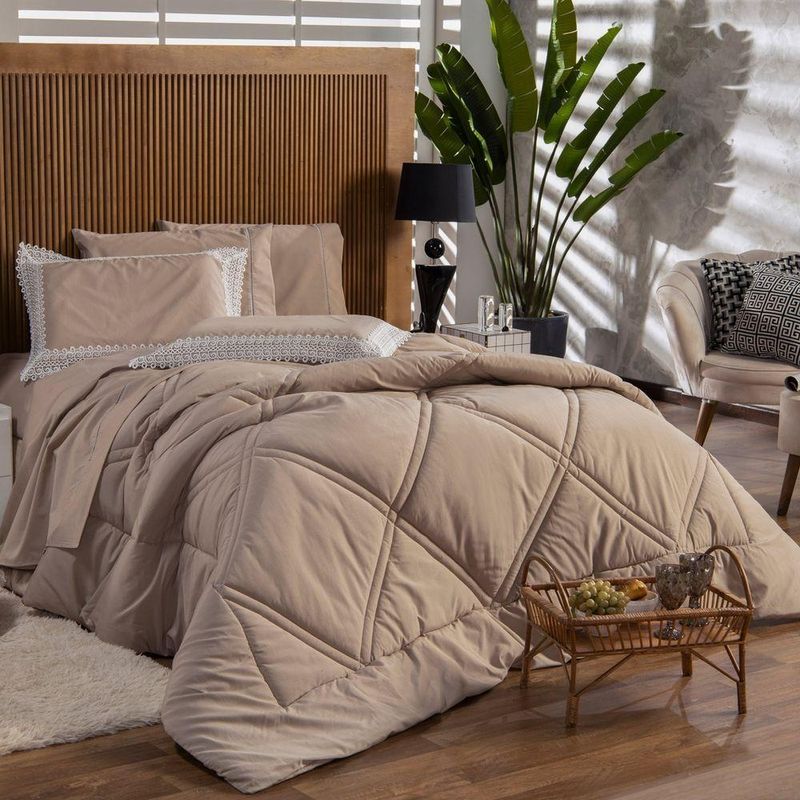 Kit Edredom Liso Casal Padrão Florença Guipir Dupla Face Com Fronhas 03 Peças - Percal Algodão 200 Fios Cor CaquiA nova coleção Florença traz toda a sofisticação e aconchego. Por possuírem dupla face, apresentam superfície que valoriza ainda mais as cores, confeccionado em pantográfica computadorizada com lindos desenhos geométricos no edredom! Composto em tecido Percal 200 Fios 80% algodão super macio com 200g de enchimento, agregando ainda mais para seu conforto! Acompanhando também dois porta-travesseiros com detalhes no acabamento em Guipir super moderno! Com a aplicação da renda Guipir se tem mais sofisticação e elegância, bonito e delicado para investir em uma decoração, totalmente em alta e é uma peça presente nas roupas e objetos decorativos por sua fácil composição e delicadeza, podendo facilmente ser utilizada em diversos ambientes para a decoração da casa, deixando tudo muito mais bonito e com um toque romântico. Ideal para decorar, trazer conforto e tornar o quarto ainda mais convidativo e elegante! Confira!Contém:01 Edredom Casal Padrão 2,50m x 2,40m02 Porta Travesseiros com Guipir 70cm x 50cmComposição:Tecido Percal 200 Fios: 80% Algodão / 20% PoliésterEnchimento: 100% poliésterInstruções de Uso e Lavagem:Vide etiqueta do produto.Atenção:Foto meramente ilustrativa.Variação das cores podem ocorrer de acordo com o monitor.