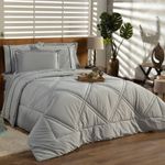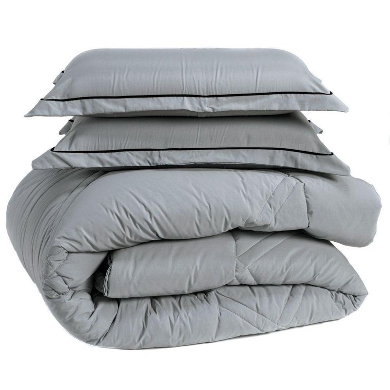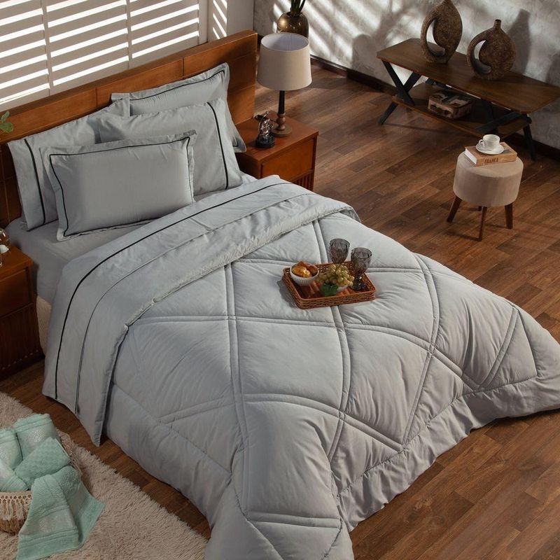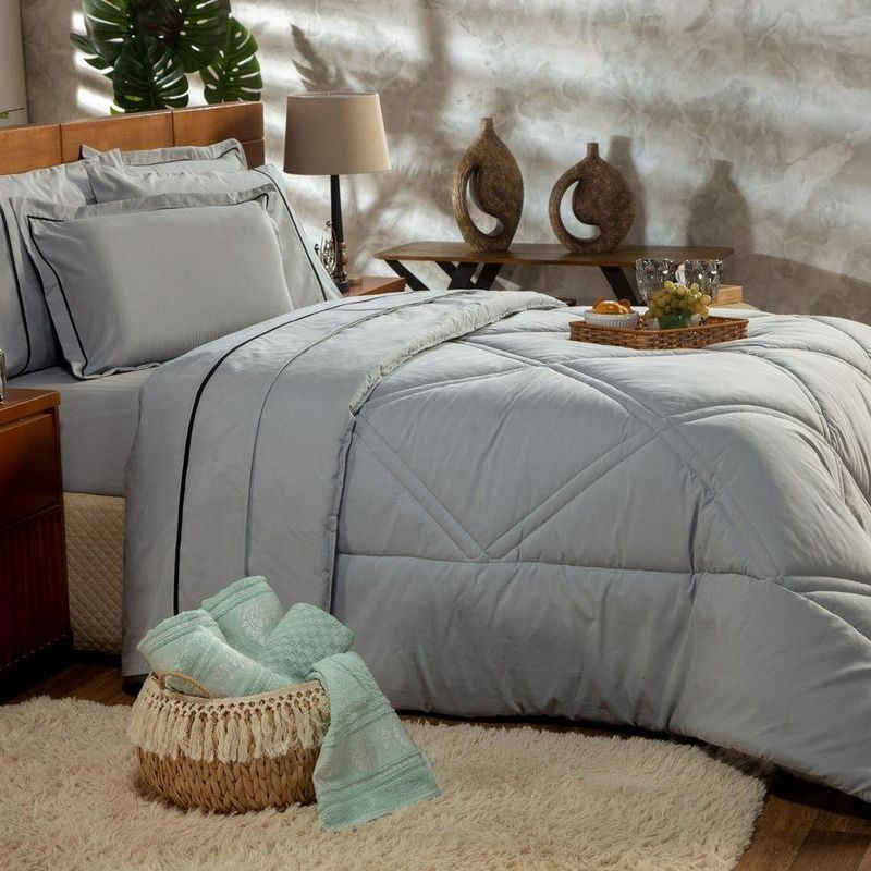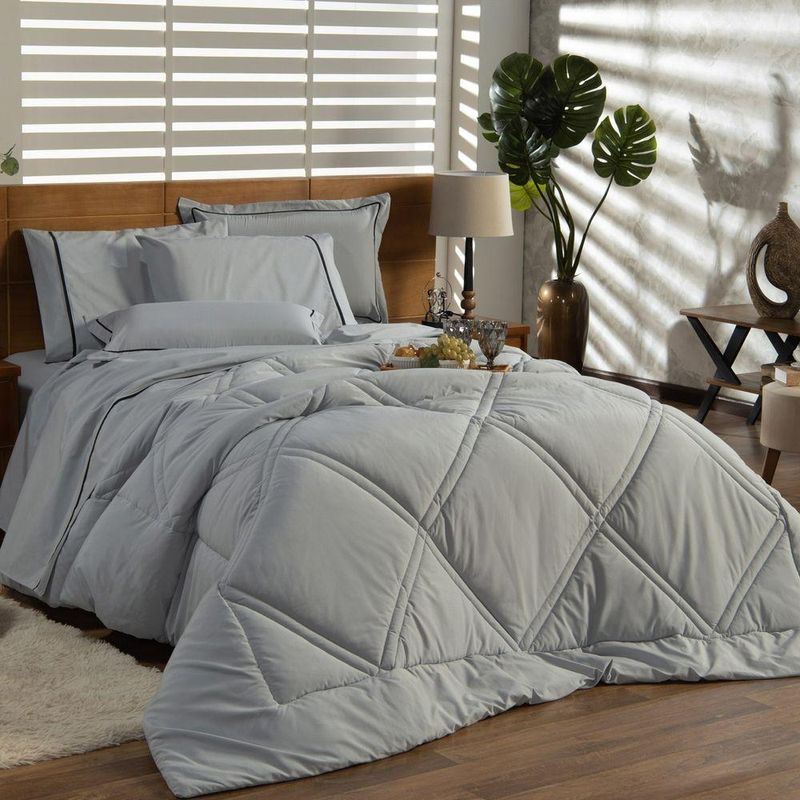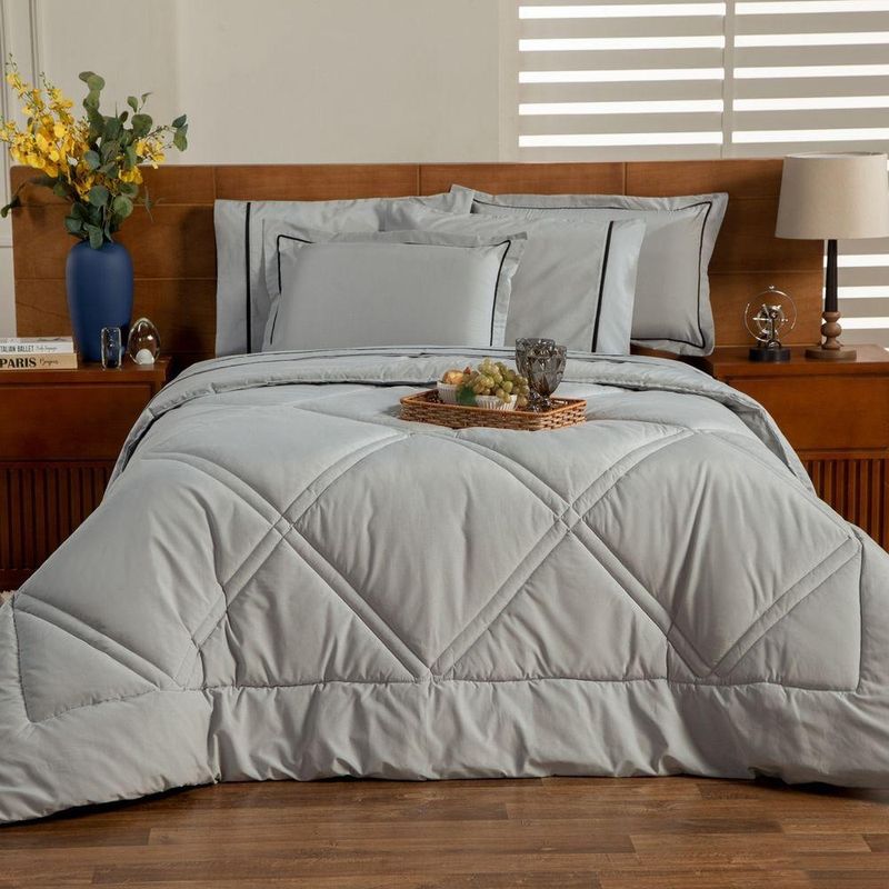 Kit Edredom Liso Queen Milano Dupla Face Com Fronhas 03 Peças - Percal Algodão 200 Fios Cor CinzaA nova coleção Milano traz toda a sofisticação e aconchego. Por possuírem dupla face, apresentam superfície que valoriza ainda mais as cores, confeccionado em pantográfica computadorizada com lindos desenhos geométricos no edredom! Composto em tecido Percal 200 Fios 80% algodão super macio com 200g de enchimento, agregando ainda mais para seu conforto! Acompanhando também dois porta-travesseiros com detalhes no acabamento em Viés super moderno! Ideal para decorar, trazer conforto e tornar o quarto ainda mais convidativo e elegante! Confira!Contém:01 Edredom Casal Queen 2,60m x 2,50m02 Porta Travesseiros com Viés 70cm x 50cmOBS: Jogo de Lençol Vendido Separadamente.Composição:Tecido Percal 200 Fios: 80% Algodão / 20% PoliésterEnchimento: 100% poliésterInstruções de Uso e Lavagem:Vide etiqueta do produto.Atenção:Foto meramente ilustrativa.Variação das cores podem ocorrer de acordo com o monitor.