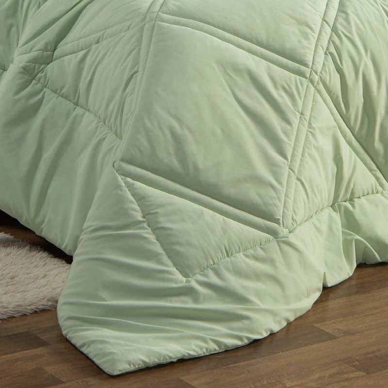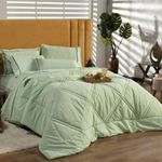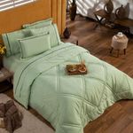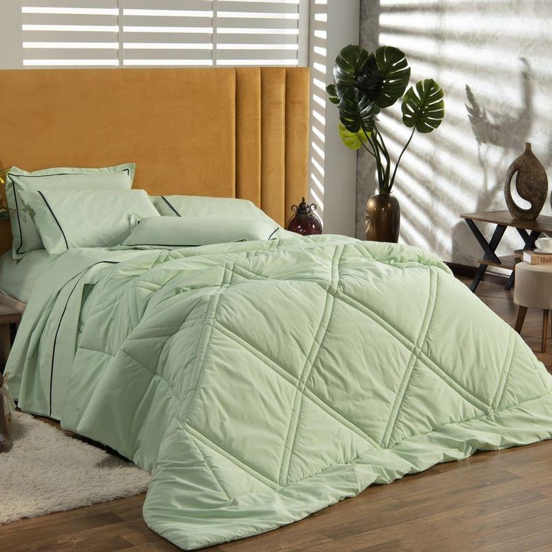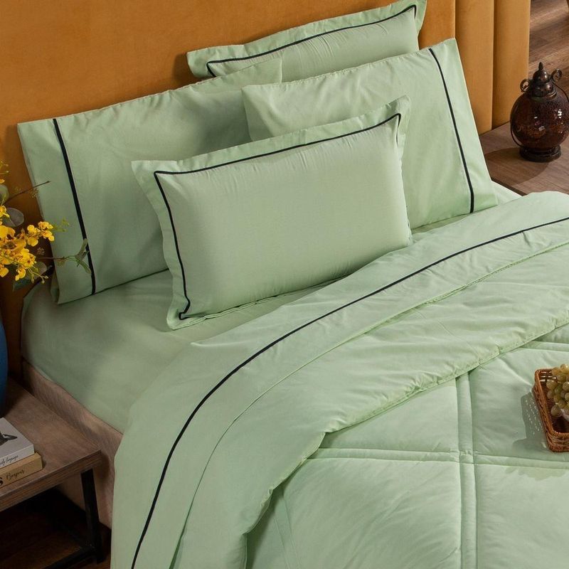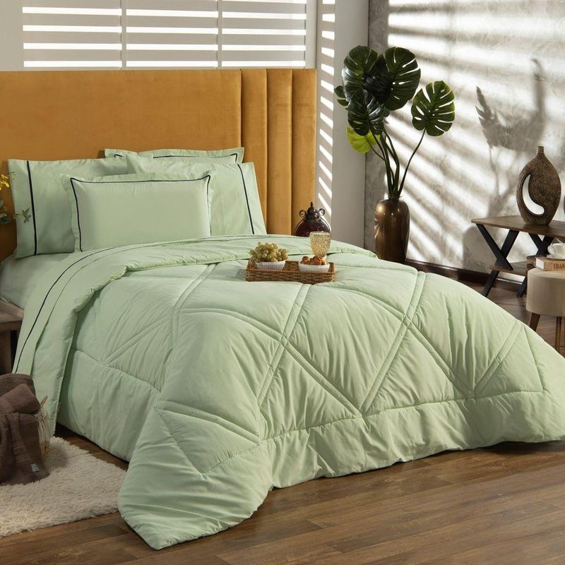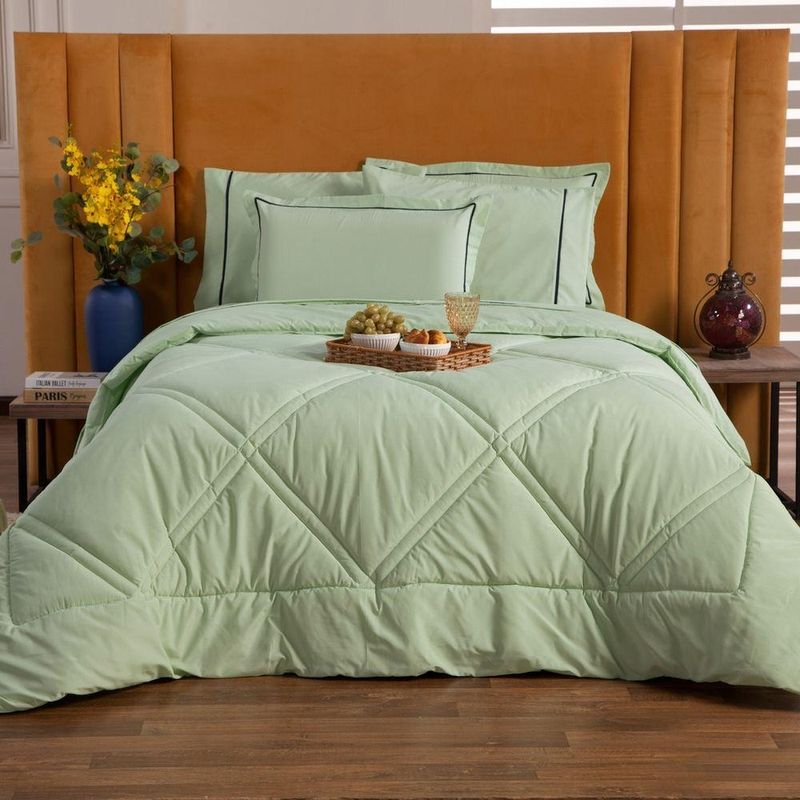 Kit Edredom Liso Queen Milano Dupla Face Com Fronhas 03 Peças - Percal Algodão 200 Fios Cor VerdeA nova coleção Milano traz toda a sofisticação e aconchego. Por possuírem dupla face, apresentam superfície que valoriza ainda mais as cores, confeccionado em pantográfica computadorizada com lindos desenhos geométricos no edredom! Composto em tecido Percal 200 Fios 80% algodão super macio com 200g de enchimento, agregando ainda mais para seu conforto! Acompanhando também dois porta-travesseiros com detalhes no acabamento em Viés super moderno! Ideal para decorar, trazer conforto e tornar o quarto ainda mais convidativo e elegante! Confira!Contém:01 Edredom Casal Queen 2,60m x 2,50m02 Porta Travesseiros com Viés 70cm x 50cmOBS: Jogo de Lençol Vendido Separadamente.Composição:Tecido Percal 200 Fios: 80% Algodão / 20% PoliésterEnchimento: 100% poliésterInstruções de Uso e Lavagem:Vide etiqueta do produto.Atenção:Foto meramente ilustrativa.Variação das cores podem ocorrer de acordo com o monitor.