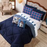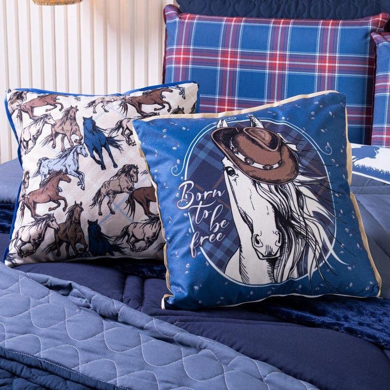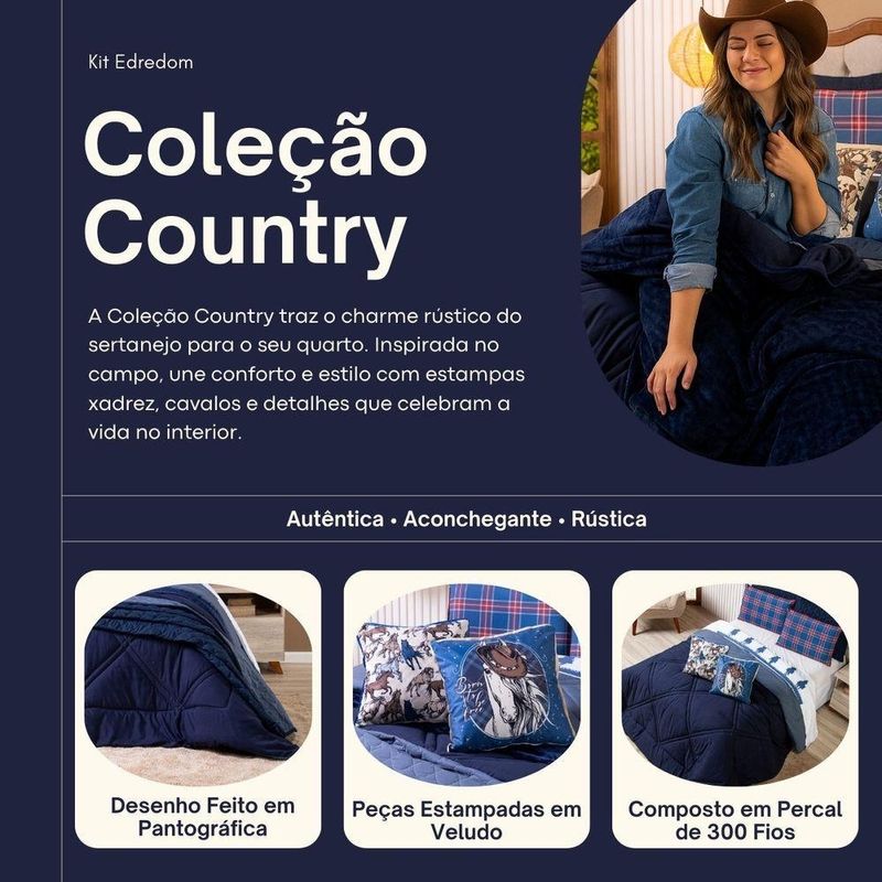Kit Edredom Queen Country Com Almofadas Estampadas 07 Peças - Dupla Face Percal 300 Fios Cor AzulO Kit Edredom Country transforma o quarto em um ambiente acolhedor e cheio de personalidade. Produzido em Percal 300 fios dupla face, o edredom oferece maciez, conforto e alta durabilidade. O conjunto acompanha fronhas e capas de almofadas em veludo estampado, trazendo o charme do estilo country com elementos como xadrez, cavalos e referências do campo. Ideal para quem busca aconchego aliado a um visual rústico e elegante, é a escolha perfeita para compor uma decoração autêntica e sofisticada. Confira!Contém: 01 Edredom Casal Queen Dupla Face 2,60m x 2,50m 02 Porta Travesseiros Lisos com Debrum 70cm x 50cm 02 Porta Travesseiros Estampados em Veludo 70cm x 50cm com Viés 02 Capas de Almofadas Estampadas em Veludo 45cm x 45cm com ViésComposição Edredom: Tecido Percal 300 Fios: 100% Poliéster Enchimento: 100% poliésterComposição Peças Estampadas: Tecido Veludo Suede: 100% PoliésterInstruções de Uso e Lavagem: Vide etiqueta do produto.Atenção: Foto meramente ilustrativa. Variação das cores podem ocorrer de acordo com o monitor.