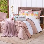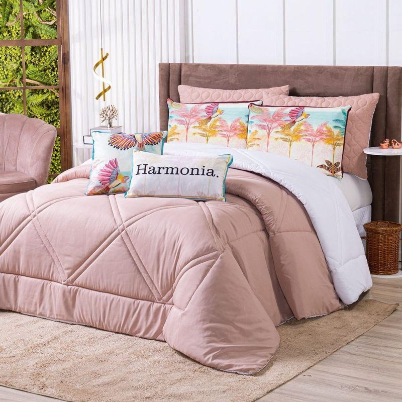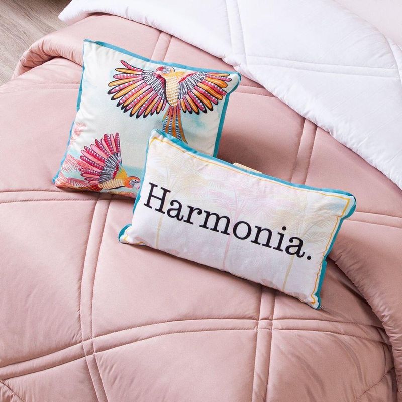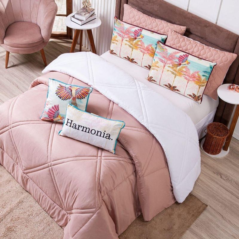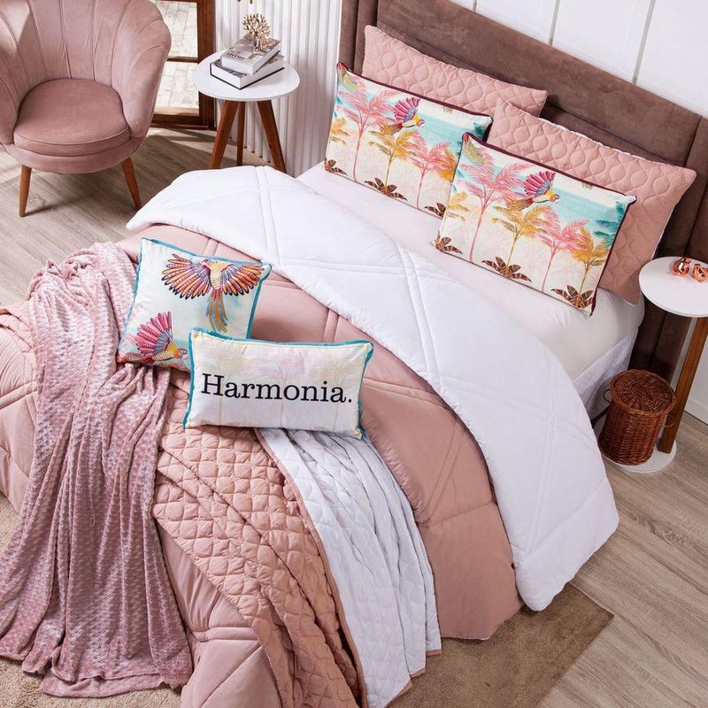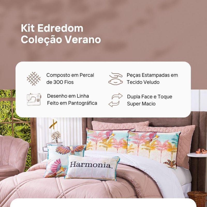 Kit Edredom Queen Verano Com Almofadas Estampadas 07 Peças - Dupla Face Percal 300 Fios Cor Arara O Kit Verano é a escolha ideal para quem deseja transformar o quarto em um espaço cheio de vida e aconchego. Inspirado na beleza da natureza, ele traz estampas vibrantes que remetem à floresta, com animais, flores e plantas em cores intensas que deixam o ambiente mais alegre e acolhedor. Produzido em percal poliéster de 300 fios, o tecido oferece um toque super macio e agradável, enquanto o enchimento alto e volumoso garante noites de sono mais confortáveis. O edredom é dupla face e conta com acabamento pantográfico computadorizado, que valoriza ainda mais o design e confere um detalhe sofisticado à peça. Para completar, o kit acompanha fronhas lisas e estampadas, além de almofadas temáticas que dão um charme e trazem uma mensagem especial à decoração, criando um conjunto prático, elegante e cheio de estilo para o dia a dia.Contém:01 Edredom Casal Queen Dupla Face 2,60m x 2,50m02 Porta Travesseiros Lisos com Debrum 70cm x 50cm02 Porta Travesseiros Estampados em Veludo 70cm x 50cm com Viés01 Almofada Cheia Retangular Estampada em Veludo 60cm x 40cm01 Capa de Almofada Quadrada Estampada em Veludo 45cm x 45cmComposição Edredom:Tecido Percal 300 Fios: 100% PoliésterEnchimento: 100% poliéster Composição Peças Estampadas: Tecido Veludo Suede: 100% PoliésterInstruções de Uso e Lavagem:Vide etiqueta do produto.Atenção:Foto meramente ilustrativa.Variação das cores podem ocorrer de acordo com o monitor.