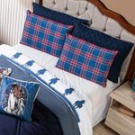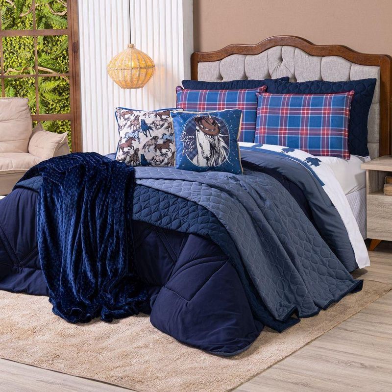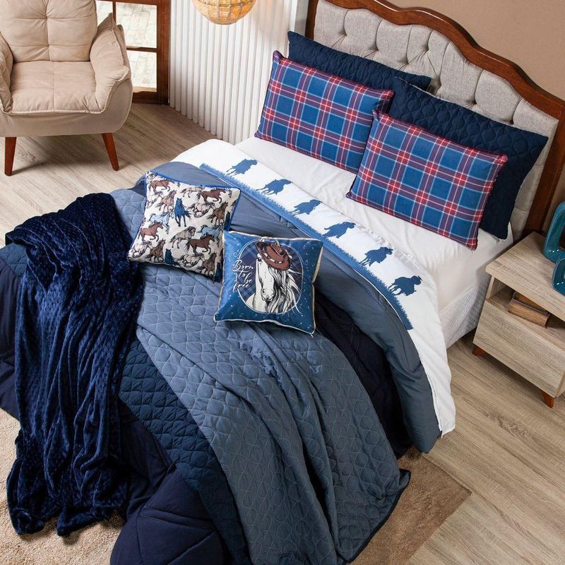 Kit Edredom Solteiro Country Com Almofadas Estampadas 05 Peças - Dupla Face Percal 300 Fios Cor AzulO Kit Edredom Country transforma o quarto em um ambiente acolhedor e cheio de personalidade. Produzido em Percal 300 fios dupla face, o edredom oferece maciez, conforto e alta durabilidade. O conjunto acompanha fronha e capas de almofadas em veludo estampado, trazendo o charme do estilo country com elementos como xadrez, cavalos e referências do campo. Ideal para quem busca aconchego aliado a um visual rústico e elegante, é a escolha perfeita para compor uma decoração autêntica e sofisticada. Confira!Contém: 01 Edredom Solteiro Dupla Face 2,50m x 2,15m 01 Porta Travesseiro Liso com Debrum 70cm x 50cm 01 Porta Travesseiro Estampado em Veludo 70cm x 50cm com Viés 02 Capas de Almofadas Estampadas em Veludo 45cm x 45cm com ViésComposição Edredom: Tecido Percal 300 Fios: 100% Poliéster Enchimento: 100% poliésterComposição Peças Estampadas: Tecido Veludo Suede: 100% PoliésterInstruções de Uso e Lavagem: Vide etiqueta do produto.Atenção: Foto meramente ilustrativa. Variação das cores podem ocorrer de acordo com o monitor.