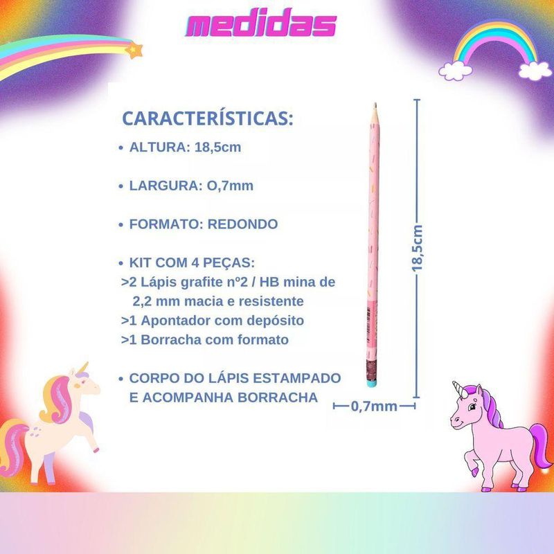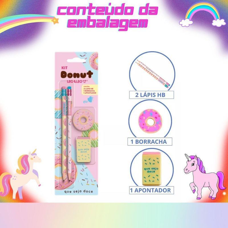 Kit Escolar Com 4 Peças Lápis Grafite Apontador Borracha Donuts Volta As AulasTransforme sua rotina escolar ou profissional com o Kit Donut 4 Itens! Compacto e funcional, este conjunto é perfeito para quem busca praticidade, qualidade e um design divertido. Ideal para crianças, adolescentes e adultos, o kit inclui tudo o que você precisa para escrever, apagar e apontar com estilo.BenefíciosEscrita Suave: Lápis grafite HB com traços precisos e macios.Segurança: Produtos atóxicos e livres de PVC, garantindo uso seguro para todas as idades.Design Divertido: Estilo único inspirado em donuts, tornando o kit irresistível.Alta Durabilidade: Materiais resistentes e de qualidade, para uso prolongado.Compacto e Portátil: Perfeito para levar na mochila, estojo ou bolsa.CaracterísticasLápis Grafite: Corpo em resina termoplástica com acabamento liso e virola de alumínio.Borracha: Atóxica, isenta de PVC, com formato prático para apagar com precisão.Apontador: Fabricado em resina termoplástica com lâmina de aço inox, seguro e eficiente.Estilo Único: Design inspirado em donuts, com cores vibrantes e modernas.Especificações TécnicasLápis Grafite: Tipo HB, ideal para escrita e desenhos técnicos.Borracha: Carga inerte e pigmentos seguros para crianças.Apontador: Lâmina de aço inox, resistente à corrosão.Composição:Lápis: Resina termoplástica, virola de alumínio, borracha de resina plástica.Apontador: Resina termoplástica e lâmina em aço inox.Borracha: Isenta de PVC, pigmentos atóxicos.Detalhes do ProdutoO Kit Donut 4 Itens é a escolha ideal para quem deseja um material escolar ou de escritório que combine funcionalidade e um toque divertido. Compacto e fácil de transportar, ele oferece a solução completa para escrever, apagar e apontar, com qualidade certificada e segurança garantida.Conteúdo da Embalagem2 lápis grafite HB.1 apontador com lâmina em aço inox.1 borracha atóxica e livre de PVC.