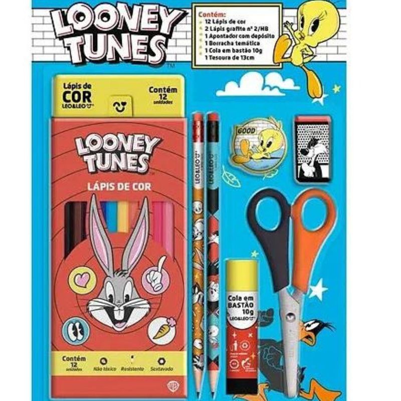 KIT ESCOLAR LAPIS DE COR 12 CORES LOONEY TUNES - CAIXA LEO & LEO Além de trazer alegria e diversão no dia a dia, Pernalonga, Piu-Piu, Patolino e toda turma clássica, deixam o estudo muito mais atrativo com o Kit Lápis de Cor Looney Tunes Leo&Leo.Para usar em sala de aula, o kit é recheado de materiais básicos para diversas atividades em sala de aula, com opções para a criança se desenvolver de forma saudável, alegre e estimulada.O Kit possui um total de 18 itens, incluindo: 1 Caixa de Lápis de cor 12 cores sextavado com mina de 2,6 mm macia resistente; 2 Lápis grafite nº 2 / HB mina de 2,2 mm macia e resistente; 1 Apontador com depósito, 1 Borracha com formato, 1 Cola bastão de 10 g e 1 Tesoura de 13 cm. Dá pra desenhar, escrever, apagar, apontar, colar e recortar tudo o que for pedido nas atividades da escola e no dever de casa.O Kit Lápis de Cor Looney Tunes Leo&Leo é atóxico e veio para ser a companhia ideal e de todos os momentos de aprendizagem da criançada. Composição: Lápis de cor: Resinas e pigmentos. Lápis grafite nº2/HB: Corpo em resina e pigmentos, virola de alumínio e borracha em resina plástica. Apontador depósito: Resina termoplástica e lâmina em aço. Borracha temática: Borracha isenta de PVC, carga inerte e pigmentos atóxicos. Cola em bastão: PVA (acetato de polivinila), glicerina, água e conservantes. Tesoura: Resina termoplástica e aço inox. INMETRO: OCP0116 REGISTRO: 006909/2020