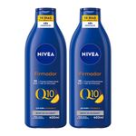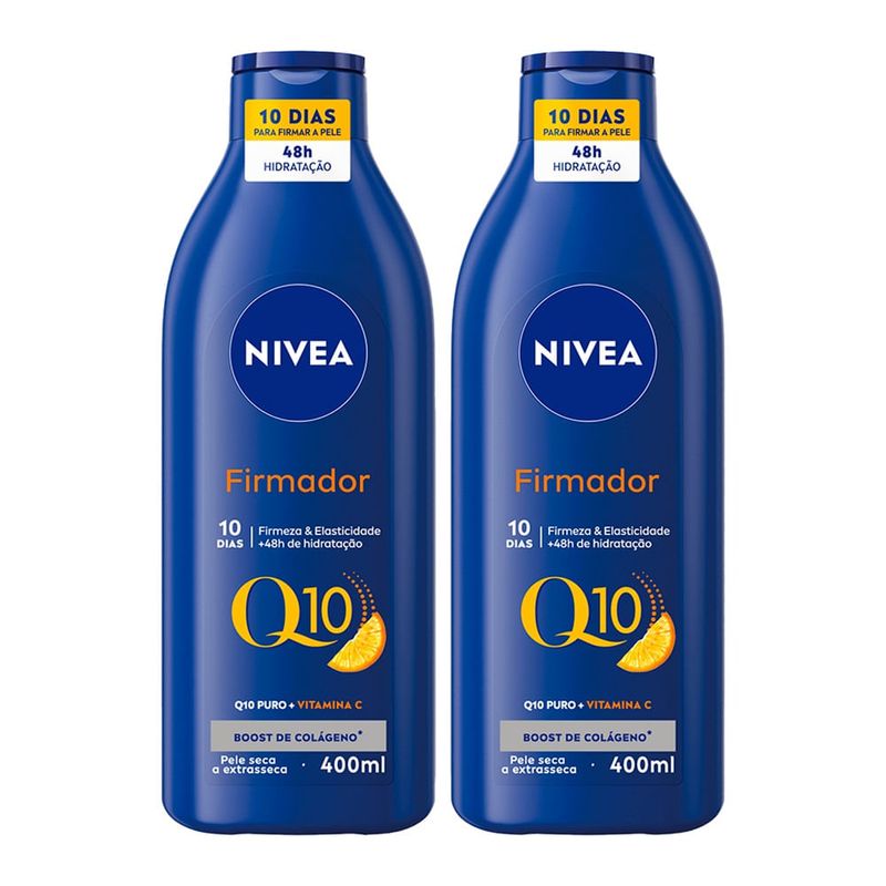 Kit Hidratante Corporal Nivea Firmador Q10 Com 2 Unidades 400ml Cada O Nivea Firmador Q10 + Vitamina C é um hidratante corporal que ajuda a firmar a pele, combatendo a flacidez e proporcionando hidratação intensa por até 48 horas. Sua fórmula combina Coenzima Q10 e Vitamina C, dois antioxidantes poderosos que estimulam a renovação celular e deixam a pele mais macia, revitalizada e tonificada. Para que serve? Indicado para peles secas e extrassecas, o Nivea Firmador Q10 atua na elasticidade e firmeza da pele, ajudando a combater sinais de envelhecimento precoce causados por agentes externos. Com o uso diário, melhora a textura da pele em apenas 10 dias, deixando-a mais hidratada e saudável. Como usar o Nivea Firmador Q10 + Vitamina C Com a pele limpa e seca, aplique o Nivea Firmador Q10 + Vitamina C por todo o corpo, exceto no rosto, massageando suavemente até completa absorção. Para melhores resultados, utilize duas vezes ao dia ou conforme recomendação médica. Benefícios e diferenciais Hidratação intensa por até 48 horas Pele mais firme e elástica em 10 dias Ação antioxidante com Q10 + Vitamina C Combate flacidez e envelhecimento precoce Textura leve e rápida absorção Fórmula sem ingredientes de origem animal Composição Aqua, Glycerin, Paraffinum Liquidum, C15-19 Alkane, C12-15 Alkyl Benzoate, Cetearyl Alcohol, Myristyl Alcohol, Ubiquinone (Q10), Sodium Ascorbyl Phosphate (Vitamina C), Sorbitan Stearate, Hydrogenated Coco-Glycerides, Dimethicone, entre outros. Advertências Uso externo. Não ingerir. Evite contato com os olhos. Em caso de contato, lave com água abundante. Não aplique no rosto. Se houver irritação, suspenda o uso e procure orientação médica. Mantenha o produto em local seco e arejado, longe da luz solar direta. Mantenha fora do alcance de crianças. Pele hidratada e mais firme em apenas 10 dias! Compre online na Farmácia Indiana!