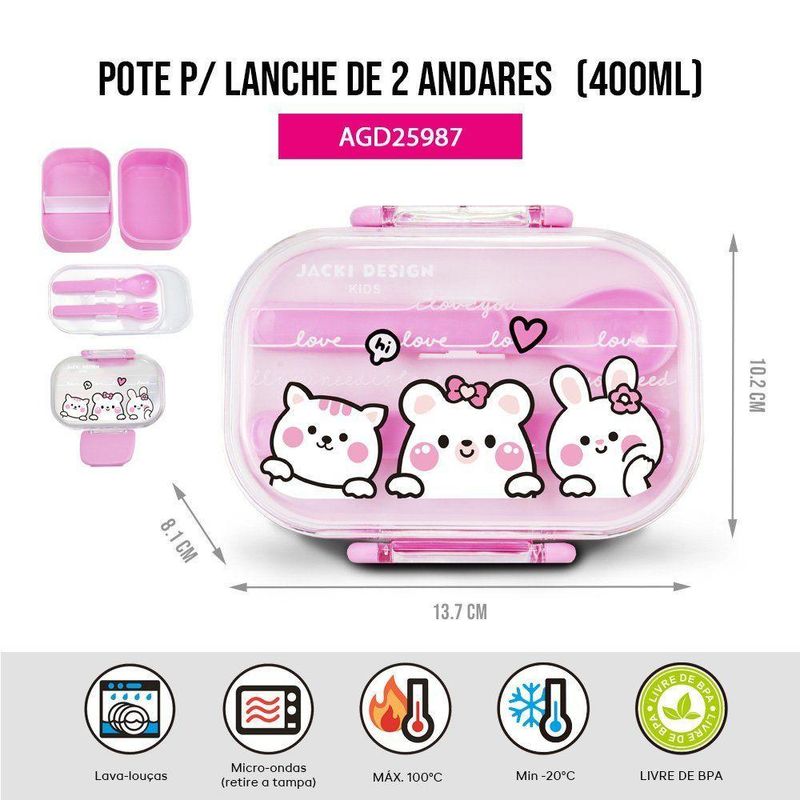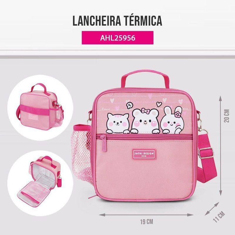 Kit Infantil 3pçs - Bolsa Térmica, Pote P/ Lanche 400ml E Garrafa 460ml - PinkKit Infantil 3pçs - Bolsa Térmica, Pote p/ Lanche 400ml e Garrafa 460ml - Pink -Kit Infantil 3 Peças – Bolsa Térmica 4.180 ml + Garrafa 460 ml + Pote para Lanche 400 ml | Jacki Design – Coleção AmiguinhosO Kit Infantil 3 Peças da Coleção Amiguinhos, da Jacki Design, é a solução completa para garantir praticidade, segurança e organização na rotina das crianças. Ideal para a escola, passeios e viagens, o kit reúne Bolsa Térmica, Garrafa 460 ml e Pote para Lanche 400 ml, todos com design funcional e estampa divertida.1. Lancheira Térmica Infantil Amiguinhos – 4.180 mlDesenvolvida para manter os alimentos frescos por mais tempo, a lancheira possui revestimento interno em folha de alumínio, que proporciona isolamento térmico eficiente. Seu design compacto e leve conta com bolso lateral, alça de mão reforçada e alças ajustáveis, garantindo conforto no transporte.Diferenciais:Capacidade total 4.180 mlIsolamento térmico em folha de alumínioBolso lateral para garrafa ou utensíliosAlça de mão + alças ajustáveisCompacta, leve e fácil de transportarEstampa lúdica da coleção AmiguinhosEspecificações:Medidas: 19 cm (C) x 11 cm (P) x 20 cm (A)Material: 50% Microfibra + 50% Folha de Alumínio2. Garrafa Infantil Amiguinhos – 460 mlA Garrafa Infantil foi projetada para tornar a hidratação mais prática e segura. Possui canudo retrátil, alça ajustável e trava com vedação, evitando vazamentos e garantindo higiene. Fabricada em material livre de BPA, é ideal para uso infantil.Diferenciais:Capacidade 460 mlCanudo retrátil e higiênicoTrava anti-vazamentoAlça ajustável para transporteDesign ergonômicoLivre de BPAEspecificações:Medidas: 8 cm (C) x 8 cm (P) x 18 cm (A)Material: PETG / Tampa em PP, livre de BPA3. Pote para Lanche 2 Andares Amiguinhos – 400 mlCom 2 andares e divisórias internas, o pote permite separar frutas, snacks e pequenos lanches. Acompanha bandeja com encaixe e talheres (garfinho e colher), tornando a refeição prática e higiênica. As travas laterais garantem um fechamento seguro.Diferenciais:Capacidade total 400 ml2 andares com divisórias internasBandeja com encaixe + talheres inclusosTravas de segurança contra vazamentosMaterial livre de BPACompacto e ideal para mochila ou lancheiraEspecificações:Medidas: 13,7 cm (C) x 10,2 cm (L) x 8,1 cm (A)Material: Tampa 38% PS | Pote 62% PPPor que escolher o Kit Infantil Amiguinhos?Kit completo para escola e passeiosMantém alimentos frescos e organizadosHidratação prática e seguraItens resistentes, leves e fáceis de limparProdutos livres de BPADesign divertido que agrada as criançasAcompanha o produto: - 1 Lancheira Térmica Infantil 4.180 ml - 1 Garrafa Infantil 460 ml - 1 Pote para Lanche 2 andares 400 ml