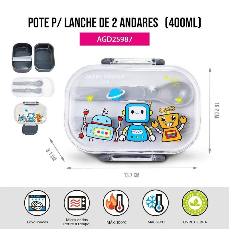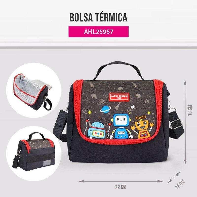 Kit Infantil 3pçs - Bolsa Térmica, Pote P/ Lanche 400ml E Garrafa 460mlKit Infantil 3pçs - Bolsa Térmica, Pote p/ Lanche 400ml e Garrafa 460ml -Kit Infantil 3 Peças – Bolsa Térmica, Garrafa 460 ml e Pote para Lanche 400 ml | Jacki Design – Coleção AmiguinhosO Kit Infantil 3 Peças da Coleção Amiguinhos, da Jacki Design, foi desenvolvido para oferecer praticidade, segurança e diversão à rotina dos pequenos. Ideal para uso escolar, passeios, viagens e atividades do dia a dia, o kit reúne itens essenciais para armazenar lanches e manter a hidratação de forma organizada e higiênica.Composto por Bolsa Térmica Infantil, Garrafa 460 ml e Pote para Lanche 400 ml, o conjunto traz estampas divertidas e funcionais, perfeitas para acompanhar crianças da primeira infância com conforto e qualidade.1. Lancheira Térmica Infantil Amiguinhos – 4.752 mlA Lancheira Térmica da Coleção Amiguinhos mantém alimentos e bebidas frescos por mais tempo graças ao seu forro interno em folha de alumínio, que oferece isolamento térmico eficiente.Conta com alça de mão, alças de ombro ajustáveis e elástico interno para garrafa, garantindo transporte seguro e confortável.Diferenciais:Capacidade ampla: 4.752 mlIsolamento térmico em alumínioAlça de mão e alças ajustáveisElástico interno para garrafaMicrofibra resistente e fácil de limparMedidas: 32 cm (C) x 18 cm (L) x 12 cm (A)Material: 50% Microfibra + 50% Folha de Alumínio2. Garrafa Infantil Amiguinhos – 460 mlSegura e prática, a Garrafa Infantil conta com canudo retrátil, trava anti-vazamento e alça ajustável, tornando o transporte mais confortável e ideal para crianças pequenas.Fabricada em material livre de BPA, garante segurança no uso diário.Diferenciais:Capacidade ideal: 460 mlCanudo retrátil e higiênicoTrava e vedação eficienteAlça ajustávelDesign ergonômico e leveMaterial livre de BPAMedidas: 8 cm (C) x 8 cm (P) x 18 cm (A)Material: Garrafa: PETG/ Tampa: PP3. Pote para Lanche de 2 Andares – 400 mlPerfeito para levar frutas, snacks e pequenas refeições, o pote possui 2 andares com divisórias internas e acompanha garfinho e colher em bandeja com encaixe.A tampa com travas de segurança evita vazamentos e mantém os alimentos protegidos.Diferenciais:Capacidade total: 400 mlDivisórias internasTalheres inclusos (garfinho e colher)Travas de segurançaLivre de BPACompacto e fácil de transportarMedidas: 13,7 cm (C) x 10,2 cm (L) x 8,1 cm (A)Material: Pote: 62% PP | Tampa: 38% PSBenefícios do Kit Completo:Conjunto ideal para escola, passeios e viagensHigiene, segurança e praticidade no dia a diaProdutos desenvolvidos especialmente para o público infantilItens coordenados da Coleção AmiguinhosMateriais resistentes e seguros, livres de BPAOrganização completa para lanches e hidrataçãoAcompanha o produto: - 1 Lancheira Térmica Infantil – 4.752 ml - 1 Garrafa Infantil com Canudo – 460 ml - 1 Pote para Lanche de 2 Andares – 400 ml - Talheres inclusos (garfinho e colher).