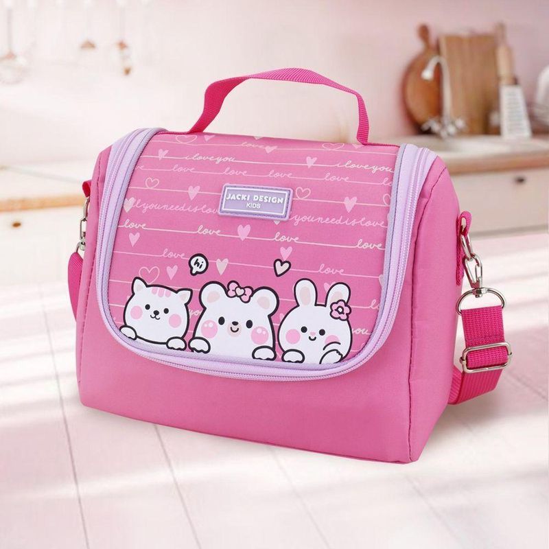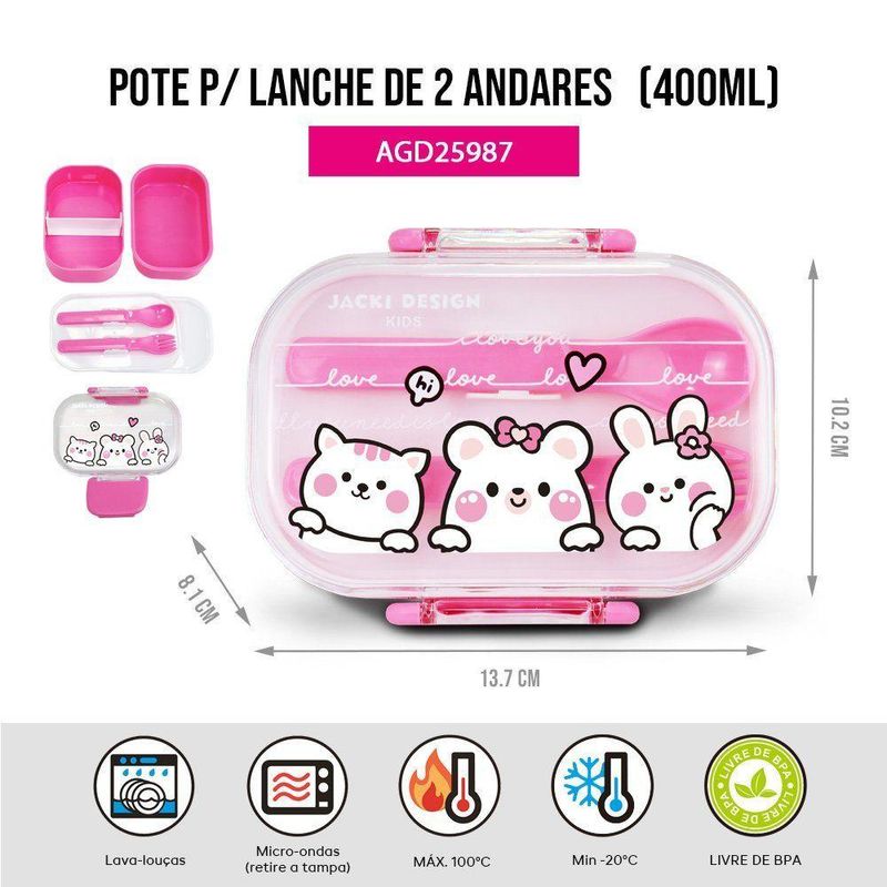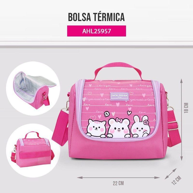 Kit Infantil 3pçs - Bolsa Térmica, Pote P/ Lanche 400ml E Garrafa 460mlKit Infantil 3pçs - Bolsa Térmica, Pote p/ Lanche 400ml e Garrafa 460ml -Kit Infantil 3 Peças – Bolsa Térmica, Garrafa 460 ml e Pote para Lanche 400 ml | Jacki Design – Coleção AmiguinhosO Kit Infantil 3 Peças da Coleção Amiguinhos, da Jacki Design, foi desenvolvido para oferecer praticidade, segurança e diversão à rotina dos pequenos. Ideal para uso escolar, passeios, viagens e atividades do dia a dia, o kit reúne itens essenciais para armazenar lanches e manter a hidratação de forma organizada e higiênica.Composto por Bolsa Térmica Infantil, Garrafa 460 ml e Pote para Lanche 400 ml, o conjunto traz estampas divertidas e funcionais, perfeitas para acompanhar crianças da primeira infância com conforto e qualidade.1. Lancheira Térmica Infantil Amiguinhos – 4.752 mlA Lancheira Térmica da Coleção Amiguinhos mantém alimentos e bebidas frescos por mais tempo graças ao seu forro interno em folha de alumínio, que oferece isolamento térmico eficiente.Conta com alça de mão, alças de ombro ajustáveis e elástico interno para garrafa, garantindo transporte seguro e confortável.Diferenciais:Capacidade ampla: 4.752 mlIsolamento térmico em alumínioAlça de mão e alças ajustáveisElástico interno para garrafaMicrofibra resistente e fácil de limparMedidas: 32 cm (C) x 18 cm (L) x 12 cm (A)Material: 50% Microfibra + 50% Folha de Alumínio2. Garrafa Infantil Amiguinhos – 460 mlSegura e prática, a Garrafa Infantil conta com canudo retrátil, trava anti-vazamento e alça ajustável, tornando o transporte mais confortável e ideal para crianças pequenas.Fabricada em material livre de BPA, garante segurança no uso diário.Diferenciais:Capacidade ideal: 460 mlCanudo retrátil e higiênicoTrava e vedação eficienteAlça ajustávelDesign ergonômico e leveMaterial livre de BPAMedidas: 8 cm (C) x 8 cm (P) x 18 cm (A)Material: Garrafa: PETG/ Tampa: PP3. Pote para Lanche de 2 Andares – 400 mlPerfeito para levar frutas, snacks e pequenas refeições, o pote possui 2 andares com divisórias internas e acompanha garfinho e colher em bandeja com encaixe.A tampa com travas de segurança evita vazamentos e mantém os alimentos protegidos.Diferenciais:Capacidade total: 400 mlDivisórias internasTalheres inclusos (garfinho e colher)Travas de segurançaLivre de BPACompacto e fácil de transportarMedidas: 13,7 cm (C) x 10,2 cm (L) x 8,1 cm (A)Material: Pote: 62% PP | Tampa: 38% PSBenefícios do Kit Completo:Conjunto ideal para escola, passeios e viagensHigiene, segurança e praticidade no dia a diaProdutos desenvolvidos especialmente para o público infantilItens coordenados da Coleção AmiguinhosMateriais resistentes e seguros, livres de BPAOrganização completa para lanches e hidrataçãoAcompanha o produto: - 1 Lancheira Térmica Infantil – 4.752 ml - 1 Garrafa Infantil com Canudo – 460 ml - 1 Pote para Lanche de 2 Andares – 400 ml - Talheres inclusos (garfinho e colher).