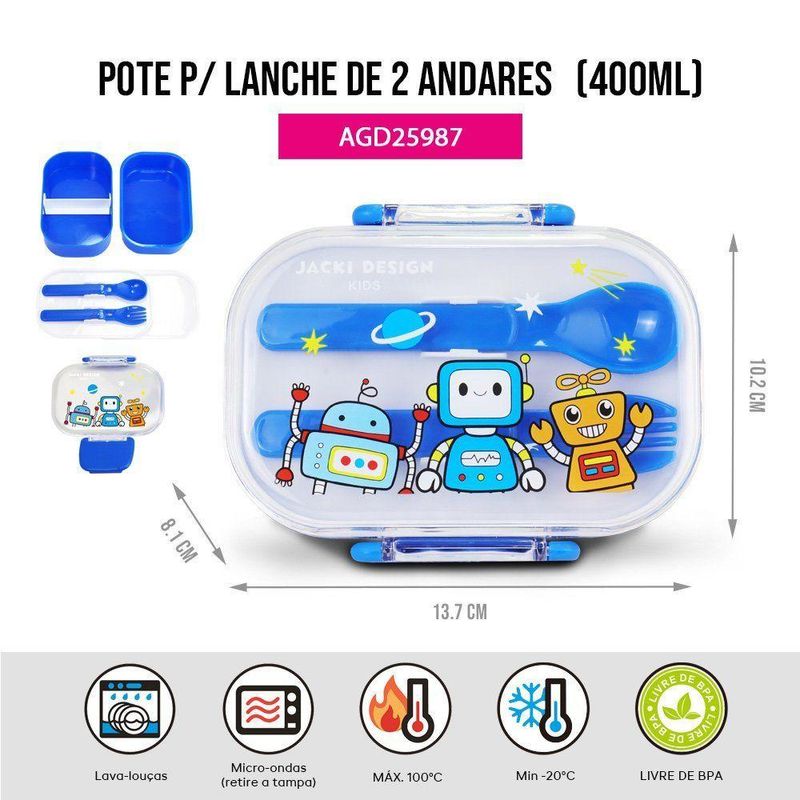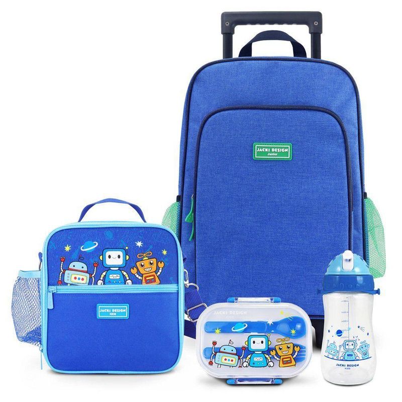 Kit Infantil 4pçs - Bolsa Térmica, Pote P/ Lanche 400ml, Garrafa 460ml E Mochila De CarrinhoKit Infantil 4pçs - Bolsa Térmica, Pote p/ Lanche 400ml, Garrafa 460ml e Mochila de Carrinho - Kit completo para escola e passeios, com organização, conforto e segurança para a rotina infantilKit Infantil 4 Peças – Bolsa Térmica + Garrafa 460 ml + Pote para Lanche 400 ml + Mochila de CarrinhoJacki Design – Coleção AmiguinhosO Kit Infantil 4 Peças da Coleção Amiguinhos, da Jacki Design, foi desenvolvido para oferecer praticidade, segurança, conforto e organização na rotina das crianças. Ideal para a escola, passeios e viagens, o conjunto reúne itens essenciais para lanches, hidratação e transporte do material escolar, tudo com design funcional e estampas divertidas que encantam os pequenos.1. Lancheira Térmica Infantil Amiguinhos – 4.180 mlA lancheira térmica mantém os alimentos frescos por mais tempo graças ao revestimento interno em folha de alumínio, que proporciona isolamento térmico eficiente. Compacta e leve, conta com bolso lateral, alça de mão reforçada e alças ajustáveis, garantindo conforto e praticidade no transporte.Diferenciais:Capacidade total: 4.180 mlIsolamento térmico em folha de alumínioBolso lateral para garrafa ou utensíliosAlça de mão e alças ajustáveisLeve, compacta e fácil de transportarEstampa lúdica da coleção AmiguinhosMedidas: 19 cm (C) x 11 cm (P) x 20 cm (A)Material: 50% Microfibra + 50% Folha de Alumínio2. Garrafa Infantil Amiguinhos – 460 mlDesenvolvida especialmente para o público infantil, a garrafa possui canudo retrátil, trava com vedação anti-vazamento e alça ajustável, garantindo mais segurança, higiene e conforto no uso diário. Fabricada com material livre de BPA, é ideal para acompanhar as crianças em qualquer atividade.Diferenciais:Capacidade: 460 mlCanudo retrátil e higiênicoTrava anti-vazamentoAlça ajustável para transporteDesign ergonômico e leveMaterial livre de BPAMedidas: 8 cm (C) x 8 cm (P) x 18 cm (A)Material: Garrafa em PETG / Tampa em PP (livre de BPA)3. Pote para Lanche 2 Andares Amiguinhos – 400 mlIdeal para frutas, snacks e pequenas refeições, o pote conta com 2 andares e divisórias internas, permitindo separar os alimentos. Acompanha bandeja com encaixe e talheres (garfinho e colher), oferecendo mais praticidade e higiene. As travas de segurança garantem fechamento firme e evitam vazamentos.Diferenciais:Capacidade total: 400 ml2 andares com divisórias internasBandeja com encaixe + talheres inclusosTravas de segurança contra vazamentosMaterial livre de BPACompacto e fácil de transportarMedidas: 13,7 cm (C) x 10,2 cm (L) x 8,1 cm (A)Material: Pote 62% PP | Tampa 38% PS4. Mochila Infantil com Rodinhas – Coleção JuniorA Mochila com Rodinhas Junior foi pensada para facilitar o transporte do material escolar, reduzindo o peso nas costas das crianças. Possui amplo espaço interno, alças acolchoadas, bolso frontal e bolso lateral, garantindo organização e conforto no dia a dia escolar.Diferenciais:Sistema com rodinhas para transporte mais leveAmplo espaço internoAlças acolchoadas para maior confortoBolso frontal e lateral para melhor organizaçãoMaterial resistente e fácil de limparMedidas: 29 cm (C) x 15 cm (L) x 40 cm (A)Material: MicrofibraCuidados:Limpar com pano úmido; se necessário, utilizar sabão neutro ou álcool. Secar à sombra. Não deixar de molho, não lavar à máquina e não utilizar produtos químicos.Por que escolher o Kit Infantil Amiguinhos Jacki Design?Kit completo para escola, passeios e viagensOrganização prática para lanches, bebidas e material escolarProdutos resistentes, leves e fáceis de limparMateriais seguros e livres de BPADesign divertido que estimula a autonomia das criançasQualidade e confiança da marca Jacki DesignAcompanha o produto: - 1 Lancheira térmica infantil1 Garrafa infantil 460 ml1 Pote para lanche 400 ml (2 andares)1 Mochila infantil com rodinhas