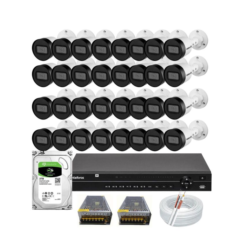 KIT CFTV DE ALTA DEFINIÇÃO INTELBRAS HD COM 32 CÂMERAS ACESSO VIA SMARTPHONE E COMPUTADOR CONTEÚDO 01 DVR INTELBRAS MHDX 1232 4X1 DE 32 CANAIS 32 CÂMERAS INTELBRAS VHD 1130B GERAÇÃO 7 HD 01 HD DE 3TB 3,5" INTERNO SATA 7200RPM 02 FONTE ELETRÔNICA CHAVEADA 12V 20A BIVOLT 100 METROS DE CABO COAXIAL FLEXÍVEL 4MM 80% DE MALHA 64 CONECTORES BNC ANTIRRUÍDO PARAFUSO E MOLA 32 CONECTORES P4 MACHO BORNE 01 MOUSE USB CARACTERÍSTICAS MHDX 1232 GRAVADOR DIGITAL DE VÍDEO COM 32 CANAIS COM SUPORTE PARA ATÉ 32 CANAIS E ARMAZENAMENTO ROBUSTO, O MHDX 1232 GARANTE ALTA QUALIDADE E FÁCIL GERENCIAMENTO DE IMAGENS. SUPORTE A ANÁLISE INTELIGENTE DE VÍDEO PARA UM CFTV MAIS ASSERTIVO, O GRAVADOR É COMPATÍVEL COM INTELIGÊNCIAS ARTIFICIAIS QUE REALIZAM A DETECÇÃO INTELIGENTE DE PESSOAS E VEÍCULOS. IMAGENS NÍTIDAS E COM RIQUEZA DE DETALHES O MODELO PERMITE A GRAVAÇÃO, VISUALIZAÇÃO E O SALVAMENTO DAS IMAGENS EM ATÉ 1080P LITE, GARANTINDO NITIDEZ E QUALIDADE EM TODAS CENAS. ALTA CAPACIDADE PARA O ARMAZENAMENTO DE IMAGENS COM CAPACIDADE PARA ATÉ 02 HDS, O MHDX 1232 POSSUI O MAIOR ARMAZENAMENTO DE IMAGENS E SUPORTE AOS ARQUIVOS DE VÍDEOS TECNOLOGIA QUE ECONOMIZA TRÁFEGO E ARMAZENAMENTO O MODELO POSSUI TECNOLOGIA H.265 +, CONSUMINDO MENOS DADOS NO TRÁFEGO DE IMAGENS E MENOS ESPAÇO, GARANTINDO UM ARMAZENAMENTO LEVE E EFICIENTE. FÁCIL DE INSTALAR, COM RECONHECIMENTO AUTOMÁTICO FÁCIL DE INSTALAR, O MODELO RECONHECE AUTOMATICAMENTE AS CÂMERAS IP INSTALADAS NA REDE E É COMPATÍVEL COM INTELBRAS CLOUD E INTELBRAS DDNS. COMPATÍVEL COM 5 TECNOLOGIAS: HDCVI + AHD + HDTVI + ANALÓGICA + IP COMPRESSÃO DE VÍDEO H.265 E H.265 + DETECÇÃO INTELIGENTE DE PESSOAS E VEÍCULOS EM 16 CANAIS SAÍDAS DE VÍDEO VGA, HDMI E BNC VISUALIZAÇÃO EM 1080P COMPATIBILIDADE COM PROTOCOLO ONVIF FUNÇÃO BNC + IP ADICIONA CÂMERAS IP AO DVR SUPORTA 2 HDS SATA DE ALTA CAPACIDADE COMPATÍVEL COM REDES WI-FI ATRAVÉS DE ADAPTADOR USB CÂMERA DE ALTA DEFINIÇÃO INTELBRAS VHD 1130 BULLET - MODELO: VHD 1130 B G7. - TECNOLOGIA: MULTI HD (HDCVI / AHD-M / HDTVI (v2.0) e Analógico (CVBS)). - RESOLUÇÃO REAL: HD - 720p (1MP). - FORMATO: Bullet. - LENTE: 2.8 mm. - SENSOR: 1/2.8 1 megapixel CMOS. - ÂNGULO DE VISÃO HORIZONTAL: 109°. - ÂNGULO DE VISÃO VERTICAL: 61°. - INFRAVERMELHO: Sim - 30 metros. - CONECTORES: BNC Fêmea e P4 Fêmea. - CASE: Plástico. - PROTEÇÃO: IP67 (proteção contra poeira e chuva) e antivandalismo. - LOCAL DE INSTALAÇÃO: Interno / Externo.