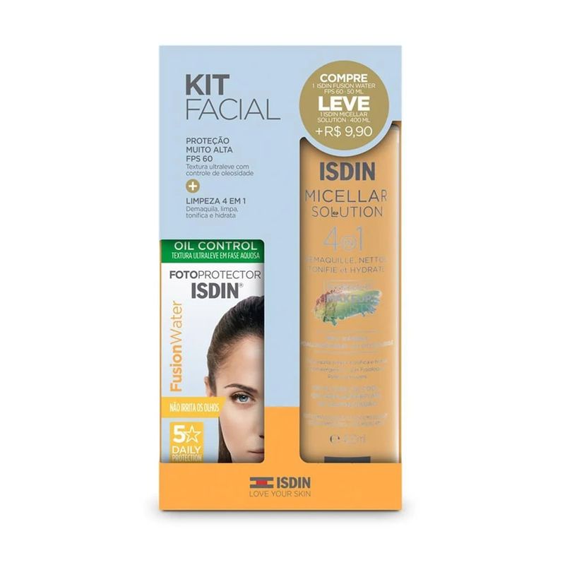 Kit ISDIN Facial Protetor Solar Fusion Water FPS 60 50ml + Água Micelar 4 em 1 400ml Rotina completa de limpeza, hidratação e proteção solar para o cuidado diário da pele. O Kit ISDIN Facial combina um protetor solar facial de alta proteção com uma solução micelar multifuncional, garantindo pele limpa, protegida, hidratada e equilibrada todos os dias. O que é o Kit ISDIN Facial? ISDIN Fotoprotector Fusion Water FPS 60 – 50ml: protetor solar facial de uso diário, sem cor e toque seco; ISDIN Micellar Solution 4 em 1 – 400ml: solução micelar hidratante que limpa, demaquila, tonifica e hidrata. Indicado para quem busca praticidade e eficácia em uma rotina diária de cuidados faciais, adequado para todos os tipos de pele, inclusive as oleosas e sensíveis. Fotoprotetor ISDIN Fusion Water FPS 60 O ISDIN Fusion Water FPS 60 é um protetor solar facial sem cor, com alta proteção contra os raios UVA e UVB. Possui textura ultraleve, toque seco e absorção imediata, proporcionando conforto e sensação refrescante na pele. É ideal para o uso diário, inclusive em peles oleosas e com tendência à acne. Sua fórmula é oftalmologicamente testada, não arde e não irrita os olhos. Benefícios do Fusion Water FPS 60 Alta proteção solar UVA e UVB (FPS 60); Textura leve, sem cor e toque seco; Efeito refrescante; Não oleoso; Não irrita os olhos; Resistente à água; Contém ativos anti-idade, como ácido hialurônico e vitamina E; Indicado para todos os tipos de pele. ISDIN Micellar Solution 4 em 1 A ISDIN Micellar Solution é uma solução de limpeza facial hidratante com ação 4 em 1. Demaquila facilmente, inclusive maquiagens mais resistentes, limpa profundamente, tonifica e hidrata a pele, deixando-a macia, luminosa e livre de impurezas. Sua fórmula suave pode ser utilizada no rosto, olhos e lábios, preparando a pele para a rotina diária de cuidados faciais. Benefícios da ISDIN Micellar Solution Demaquila de forma suave e eficaz; Remove impurezas e resíduos de maquiagem; Limpa profundamente todos os tipos de pele; Tonifica e ajuda a minimizar a aparência dos poros; Hidrata profundamente; Indicada inclusive para peles sensíveis. Modo de Uso ISDIN Micellar Solution: aplicar diariamente, pela manhã e à noite, com o auxílio de um algodão, limpando suavemente o rosto e o pescoço. Não necessita enxágue. Fusion Water FPS 60: aplicar generosamente sobre a pele do rosto cerca de 30 minutos antes da exposição solar. Reaplicar a cada 2 horas ou sempre após sudorese intensa, nadar, banhar-se ou secar-se com toalha.