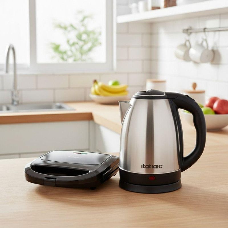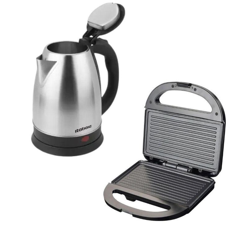 Kit Itatiaia Chaleira Elétrica 1,8l E Grill/sanduicheira Preto/inox 220 VO Kit Itatiaia Essencial une dois eletrodomesticos essenciais para sua rotina: a Chaleira Eletrica 1,8 L e o Grill / Sanduicheira 750W. Com esse combo, voce prepara bebidas quentes com rapidez e ainda grelha sanduiches, carnes ou lanches de forma pratica e segura.A chaleira, com 1500 W, ferve agua rapidamente e tem corpo em inox, alca isolante e base removivel, oferecendo eficiencia e seguranca para o dia a dia. Ja o grill/sanduicheira traz potencia de 750 W, placas antiaderentes, trava de seguranca na alca e LEDs indicadores, garantindo versatilidade no preparo sem sacrificar a praticidade. Este kit e ideal para quem quer otimizar espaco na cozinha, com aparelhos compactos, duraveis e faceis de limpar. Perfeito para apartamentos, cozinhas minimalistas ou para quem valoriza agilidade e praticidade no preparo de refeicoes e bebidas. Manutencao e cuidados: Limpe a chaleira com pano umido e sabao neutro; para o grill, use pano ou esponja macia e evite produtos abrasivos para preservar o antiaderente. Chaleira Itatiaia 1,8 L Marca: Itatiaia Potencia: 1500 W Capacidade: 1,8 Litros Alca: Isotermica Acionamento: Botao liga/desliga Base: Removivel Medidas: 21,5 cm x 18,3 cm x 14,5 cm Grill / Sanduicheira Itatiaia Essencial 750W Potencia: 750 W Temperatura maxima: ate 200 C Chapa: Grill antiaderente ondulada Alca: Com trava de seguranca Luz indicadora de funcionamento: Sim Base antiderrapante: Sim Medidas: 7,2 cm x 21,7 cm x 21,7 cm