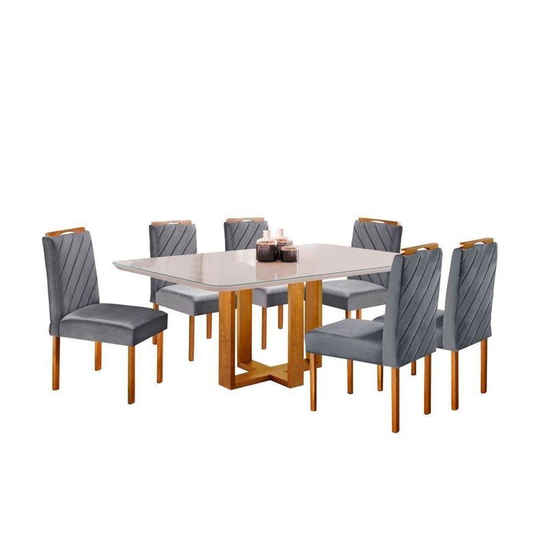 Conjunto Sala De Jantar 6 Lugares Mesa Tampo Em Vidro E Cadeiras Lisy Veludo Móveis Mix Mel/offwhite/cinza ProfundoCom os produtos Móveis Mix você leva conforto e beleza para o seu lar. Design moderno e sofisticado. Características da Mesa: Material da Estrutura: Compensado de 4mm, em lâmina de Madeira Natural Tampo Mesa: Borda Encabeçada MDF 25mm Vidro Mesa: Vidro laqueado de 3mm Características da Cadeira: Material da Estrutura: Madeira Maciça de Eucaliptus Tratado, 100 Imunizado e Seco em Estufa Assento: Espuma D26 Soft Real Encosto: Espuma D18 Soft Real Aplique no Encosto(Puxador): Sim Assento/Pés: Reforçado Capacidade em KG por Assento: Aproximadamente 150kg Necessita Montagem: Sim, necessário montador Dimensões da mesa: Altura aproximada: 78 cm Comprimento aproximado: 160 cm Largura (Profundidade): 90 cm Dimensões da cadeira: Altura aproximada: 102 cm Comprimento aproximado: 47 cm Largura (Profundidade): 56 cm Garantia: 3 meses contra defeito de fabricação (a contar da data do recebimento da mercadoria). Observação! Limpeza: Aspirar o produto para eliminar a poeira, utilizar um pano levemente umedecido. Recomendações: Usar em local seco, não molhar. Evitar exposição ao sol, para que o produto não sofra alterações na tonalidade e estrutura. A tonalidade do produto pode variar entre a imagem de exibição e o item físico. Imagens meramente ilustrativas. Não nos responsabilizamos pela montagem/instalação dos produtos. Os objetos que ambientam as fotos não acompanham o produto. Verifique as dimensões do produto e certifique-se que o percurso que ele fará até o local de uso permite sua passagem. Nós não nos responsabilizamos por transporte de produtos, caso não caibam em elevadores, acima de três lances de escada e não cabendo na passagem das escadas, por içamentos ou desmontagens de produtos. Quaisquer despesas deste tipo ficam a cargo do cliente. Anúncio sujeito a alteração sem aviso prévio. Nossos produtos passam por um rigoroso controle de qualidade para que cheguem até o cliente em perfeitas condições, entretanto, em casos de desacordo com o proposto, o comprador deverá contatar o nosso SAC. O prazo para solucionar os problemas identificados é de até 30 dias úteis, contados a partir da data do posicionamento do SAC com o comprador.Cor: Mel/OffWhite/Cinza Profundo