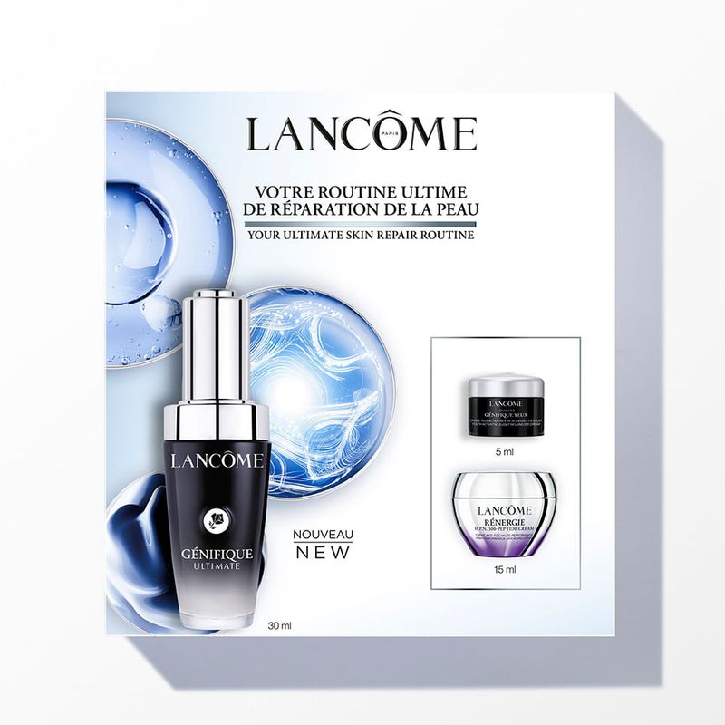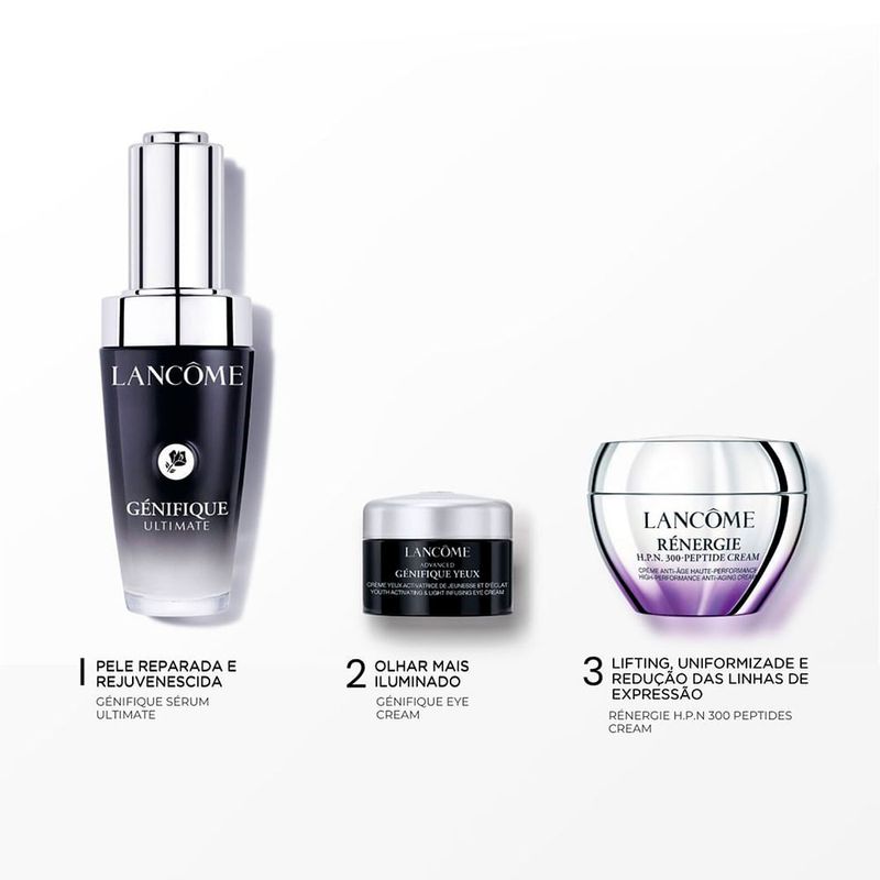 Kit Lancôme Génifique Ultimate Feminino - Sérum Facial 30ml + Sérum Olhos 5ml + Sérum Renergie H.P.N. 300 Peptídeos 15ml Descrição do Produto: Kit Lancôme Génifique Ultimate é o conjunto premium para a mulher madura que deseja pele rejuvenescida, firme e radiante com fórmula inovadora de microbioma fortalecido, ácido hialurônico e 300 peptídeos que combatem linhas, perda de firmeza e tom irregular. Este kit inclui Sérum Génifique 30ml para renovação global, Sérum Génifique Yeux 5ml para contorno dos olhos e Sérum Renergie H.P.N. 300 Peptídeos 15ml para firmeza intensa, proporcionando hidratação profunda, brilho imediato e elasticidade visível, transformando a rotina em um ritual de luxo que eleva a confiança com pele mais jovem e glow natural o dia todo. Características: Marca: Lancôme Linha: Génifique / Renergie Categoria: Kit Sérum Facial Benefícios: Renovação do microbioma, firmeza intensa, redução de linhas e manchas, hidratação profunda, brilho e elasticidade visíveis. Ingredientes Principais: Prebióticos e probióticos (Génifique), ácido hialurônico, 300 peptídeos (Renergie H.P.N.), vitamina C estabilizada, extratos botânicos. Modo de Aplicação: Aplique o Sérum Génifique 30ml manhã e noite após limpeza, massageando até absorver. Use o Sérum Génifique Yeux 5ml no contorno dos olhos com toques leves. Aplique o Sérum Renergie H.P.N. 15ml em seguida para firmeza extra, massageando suavemente. Use diariamente para resultados acumulativos. Especificações do Produto: Família Olfativa: Não aplicável (tratamento facial) Gênero: Feminino Concentração: Sérum Ocasião: Dia a Dia, Rotina de Cuidados, Dia e Noite Nome do Produto: Kit Génifique Ultimate Linha: Génifique / Renergie Versão: Set 25 Notas de Topo: Não aplicável (tratamento facial) Notas de Coração: Não aplicável (tratamento facial) Notas de Fundo: Não aplicável (tratamento facial) Benefícios do Produto: Eficácia: Fortalece o microbioma, reduz linhas finas, melhora firmeza e brilho em semanas de uso, ideal para peles maduras ou com sinais de idade. Durabilidade: Efeito cumulativo com melhora visível em 2 semanas, hidratação e brilho por horas. Versatilidade: Perfeito para rotinas completas manhã e noite, todos os tipos de pele madura, combinado com creme da linha para maior eficácia. Design ou Praticidade: Frascos de 30ml, 5ml e 15ml pump luxuosos, embalagem Set 25 elegante e prática para viagem ou teste. Escolha o Kit Lancôme Génifique Ultimate por sua inovação tripla que entrega resultados de clínica em casa com acessibilidade, oferecendo transformação sensorial que inspira juventude e confiança natural, essencial para quem deseja pele firme, luminosa e rejuvenescida com luxo em cada aplicação.