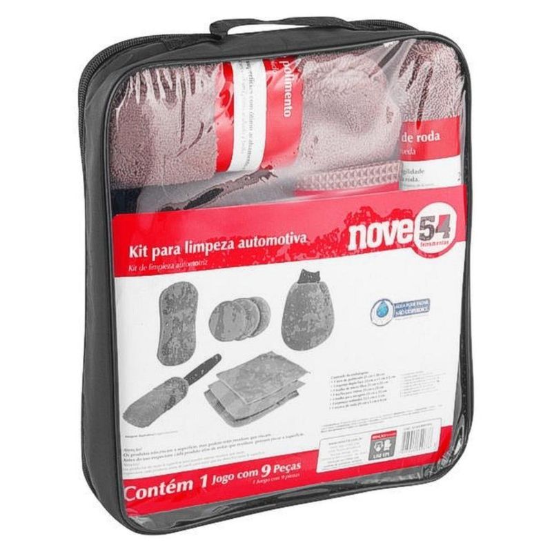 Kit Limpeza 9 Peças Detalhamento Automotivo Carros MotosO Kit para Limpeza Automotiva NOVE54 oferece 9 peças essenciais para polimento, secagem e limpeza de vidros, espelhos e carroceria. Com luva de polimento, toalhas de microfibra, esponjas e escova para rodas, garante praticidade e eficiência no cuidado do seu veículo.Aplicação:Ideal para o detalhamento e limpeza automotiva, proporcionando um polimento impecável, secagem eficiente e higienização precisa de vidros, espelhos e superfícies delicadas.O kit contém:- 1 Luva de polimento (25 cm x 20 cm)- 1 Esponja dupla face (22 cm x 12 cm x 5 cm)- 1 Toalha de microfibra (25 cm x 25 cm)- 1 Toalha para vidros (25 cm x 25 cm)- 1 Toalha para secagem (25 cm x 25 cm)- 3 Esponjas redondas (12,5 cm x 2 cm)- 1 Escova de roda (29 cm x 5 cm x 4 cm)Contém:01 Kit Para Limpeza AutomotivaReferência: Obs: Não nos responsabilizamos por danos ou ocasionados por erros de montagem e/ou aplicação inadequada do produto. NA