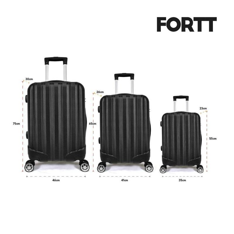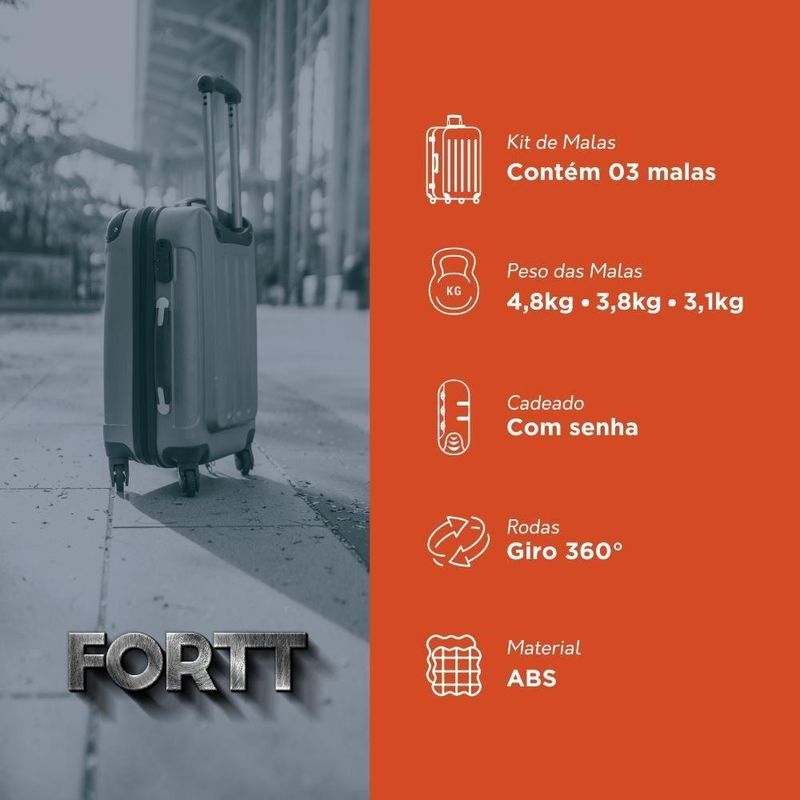 Kit Mala De Viagem Abs 3 Peças Adventure Fortt Preta - Kmv01-ptA Mala de Bordo Adventure Fortt, foi desenvolvida com o que há de mais moderno. Ela é produzida em ABS, que é um material resistente e de fácil limpeza. Possui 4 rodas com giro de 360°, é equipada com cadeado fixo, com senha configurável para a proteção de seus itens e internamente, possui cintas elásticas para lhe ajudar na organização de seus pertences.Características Parte Externa:Cor: Preta;Estrutura rígida em ABS;Cadeado fixo com senha configurável;Alça de alumínio retrátil com regulagem de altura;Alça superior e lateral;4 Rodas com giro 360º.Parte Interna:Forro em nylon;Cinta elástica com trava;Bolso interno na tampa;Amplo espaço interno;2 Compartimentos internos.Dimensões externas(AxLxP):20: 55x35x23 cm24: 65x41x26 cm28: 75x46x30 cmPeso Suportado:Pequena 8KGMedia 10KGGrande 20KGGarantia legal de 90 dias para de fabricação- Material resistente com um rigoroso controle de qualidade, unindo versatilidade, praticidade e durabilidade.- O tom da cor do produto pode variar de acordo com lote e/ou características do seu monitor ou tela.- Fotos Meramente ilustrativas.Departament01: . | produto: mala de bordo | Tipo: . | Profundidade: 22 | cor: preto | Material: plastico