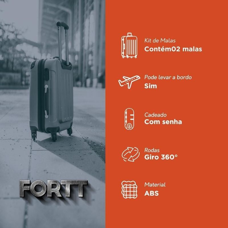 Kit Mala De Viagem Abs 2 Peças Adventure E Action Fortt Mab01-re Rose Kit Mala de Viagem abs 2 peças Adventure e Action Fortt Rose MAB01-REA Mala de Bordo Adventure Fortt, foi desenvolvida com o que há de mais moderno. Ela é produzida em ABS, que é um material resistente e de fácil limpeza. Possui 4 rodas com giro de 360°, é equa com cadeado fixo, com senha configurável para a proteção de seus itens e internamente, possui cintas elásticas para lhe ajudar na organização de seus pertences.Pode ser utilizada como bagagem de mão em aviões.Características Parte ExternaCor: RoseEstrutura rígida em ABSCadeado fixo com senha configurávelAlça de alumínio retrátil com regulagem de alturaAlça superior e lateral4 Rodas com giro 360ºParte Interna:Forro em nylonCinta elástica com travaBolso interno na tampaAmplo espaço interno2 Compartimentos internosMALA 20Dimensões externas:Altura com a alça totalmente esticada: 90cmAltura com a alça abaixada: 55,5cmLargura: 34,5cmProfundidade: 24cmDimensões internas:Altura: 47cmLargura: 35cmProfundidade: 18,5cmPeso suportado: 10 kgPeso: 2,4kgMAPA 18Dimensões externas:Altura com a alça totalmente esticada: 90cmAltura com a alça abaixada: 51 cmLargura: 32,5 cmProfundidade: 22,5 cmDimensões internas:Altura: 44 cmLargura: 32 cmProfundidade: 11 cmPeso suportado: 10 kgPeso: 2,4kgGarantia legal de 90 dias para de fabricação.- Material resistente com um rigoroso controle de qualidade, unindo versatilidade, pde e durabilidade.- O tom da cor do produto pode variar de acordo com lote e/ou características do seu monitor ou tela.- Fotos Meramente ilustrativas.Marca: Fortt | Modelo: MAB01-RE | Cor: Rose | Produto: Kit Mala