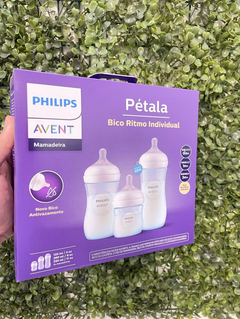 Tenha tranquilidade de comprar com quem está disposto a te oferecer o melhor atendimento.A Feccomerce tem a missão de garantir a satisfação total do seu cliente, tanto nos produtos quanto no atendimento. Assim estabelecendo uma relação de confiança e satisfação. Nossos produtos são 100% originais, lacrados como vem do fabricante._______________________________________Fiz a compra, o que irei receber?- 1 Mamadeira Pétala 125 ml com bico nº 2, fluxo lento; Recém-Nascido. (Azul)- 1 Mamadeira Pétala 260 ml com bico nº 3, fluxo médio; 1 a 3 meses de vida. (Azul)- 1 Mamadeira Pétala 330 ml com bico nº 4, fluxo rápido; 3 a 6 meses de vida. (Azul) - 2un Bico Pétala Antivazamento nº 5, acima de 6 meses. - Manual De Instruções. ÓTIMO PARA PRESENTE!_________________________________________ Sobre o Kit Triplo Pétala Antivazamento Azul: Este kit de mamadeiras da marca Avent Pétala oferece praticidade e qualidade para a alimentação do seu bebê. Com três tamanhos diferentes (125 ml, 260 ml e 330 ml), estas mamadeiras são ideais para acompanhar o crescimento e as necessidades do seu pequeno. O design da mamadeira Avent Pétala é pensado para facilitar a sucção natural, proporcionando uma experiência confortável e agradável durante a alimentação. Além disso, seu sistema de ventilação Airflex reduz a ingestão de ar, ajudando a prevenir cólicas e desconfortos abdominais. Fabricadas com materiais seguros e livres de BPA, estas mamadeiras garantem a segurança e o bem-estar do seu bebê a cada uso. _________________________________________ Sobre o Bico Pétala Antivazamento nº 5: Bico Natural Response que possui a válvula desenhada especialmente para que o bebê controle o fluxo. Única válvula capaz de interromper totalmente o fluxo quando o bebê para de sugar.Nova válvula inovadoraO bico Natural Response funciona com o fluxo e ritmo individualizado para cada bebê.Bico Anti-gotejamentoA abertura do bico foi desenhada para liberar leite apenas quando ativada.Bico flexível e macio.Feito em silicone isento de odor e sabor.Permite o desenvolvimento correto da dentição, palato e gengivas. Use Somente os bicos da linha Pétala com as mamadeiras Pétala Philips Avent, é recomendado que substitua os bicos a cada 3 meses por questões de higiene. _________________________________________ Instruções para limpar mamadeiras e bicos Philips Avent: Usando a pia: Solte o bico da mamadeira. Limpe todas as peças com uma escova de cerdas macias (use apenas um sabão suave).- Usando a lava-louças: Solte o bico da mamadeira. Coloque as peças na grade superior da lava-louças (use apenas um sabão suave próprio ou em tablete).- Evite usar toalhas, esponjas (abrasivas) e escovas com cerdas, pois, elas podem desgastar o silicone ou retirar a tinta da mamadeira. Recomendamos que você use a escova de mamadeira e bico Philips Avent e que os lave com cuidado. _________________________________________ Produto Isento de Registro, conforme Resolução Nº10, de 21/10/1999, da ANVISA. Produto de acordo com NBR 13.793.Inmetro: OCP 0040 Compulsório.O Ministério da Saúde Adverte: A criança que mama no peito não necessita de mamadeira, bico ou chupeta. O uso de mamadeira, bico ou chupeta prejudica a amamentação e seu uso prolongado, prejudica a dentição e a fala da criança. _________________________________________ A empresa Feccomerce agradece a preferência e aguarda sua compra!
