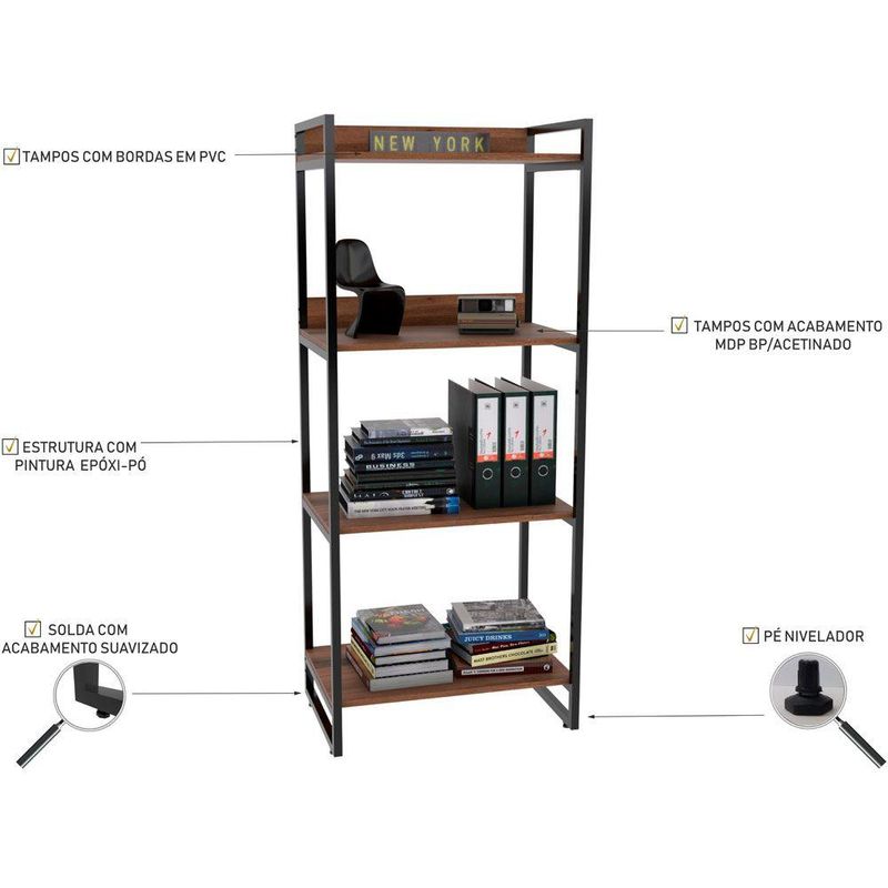 Descrição do produto: Há muito mais história no estilo de decoração industrial do que você imagina. O estilo icônico é inspirado nas decorações de grandes lofts dos anos 60 em Nova York, e que volta com tudo na atualidade. Outra característica muito forte deste estilo é a união do tubular de estrutura exposta com a madeira, que dão todo o charme para agregar no estilo que está entre os mais buscados no ramo de arquitetura e decoração. Com a linha Form, o conceito industrial ficará evidente no seu ambiente, tornando o mesmo muito mais moderno e sofisticado. Dimensões da Mesa Cavalete (L x A x P) 135 x 75 x 60 cm Características da Mesa Cavalete: Tampo produzido em MDP engrossado de 30mm, com acabamento em BP acetinado. Fita de borda em PVC. Pés em tubo de aço com sapatas niveladoras e acabamento em pintura texturizada epóxi, responsável por criar alta resistência á umidade e produtos químicos, facilitando também na limpeza e manutenção. Solda com acabamento suavizado. Produto na cor Nogal. Produto entregue desmontado, acompanha manual de montagem. Limpeza apenas com pano úmido, não aplicar lustra móveis. Dimensões da Estante (L x A x P) 60 x 145,8 x 40 cm Características da Estante: Tampo produzido em MDP de 15mm, com acabamento em BP acetinado. Pés em tubo de aço com sapatas niveladoras de altura e acabamento em pintura texturizada epóxi, responsável por criar alta resistência á umidade e produtos químicos, facilitando também na limpeza e manutenção. Fita de borda em PVC. Solda com acabamento suavizado. Produto na cor Nogal. Suporta 5 kg por prateleira. Produto entregue desmontado, acompanha manual de montagem. Limpeza apenas com pano úmido, não aplicar lustra móveis. Observações importantes: A montagem será de responsabilidade do comprador; Responsabilizamo-nos pela entrega em todo território nacional, até onde as rodovias alcançam, entregas fluviais ou aéreas devem ser cotadas a parte; As imagens são ilustrativas, não acompanham objetos de decoração e eletrônicos; Não nos responsabilizamos, no ato da entrega, por subir escadas/elevadores ou transporte por guincho em apartamentos. Eventuais despesas são de responsabilidade do comprador; Confira as dimensões do produto e certifique-se de que passará normalmente por supostos elevadores, portas, escadas e/ou corredores de sua residência;