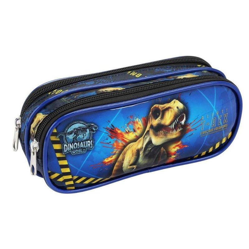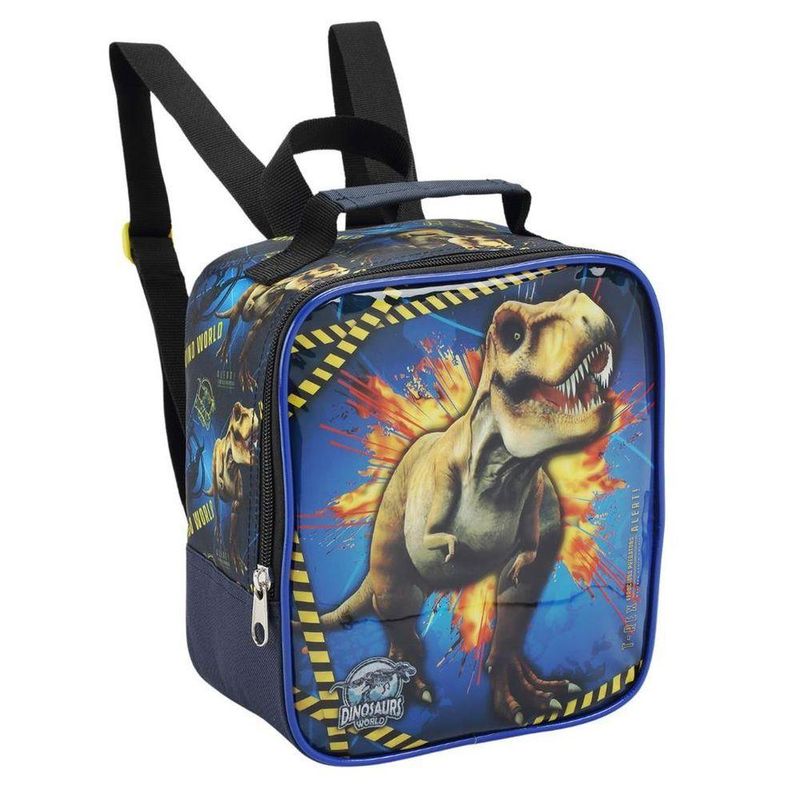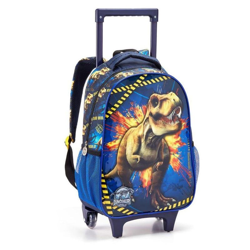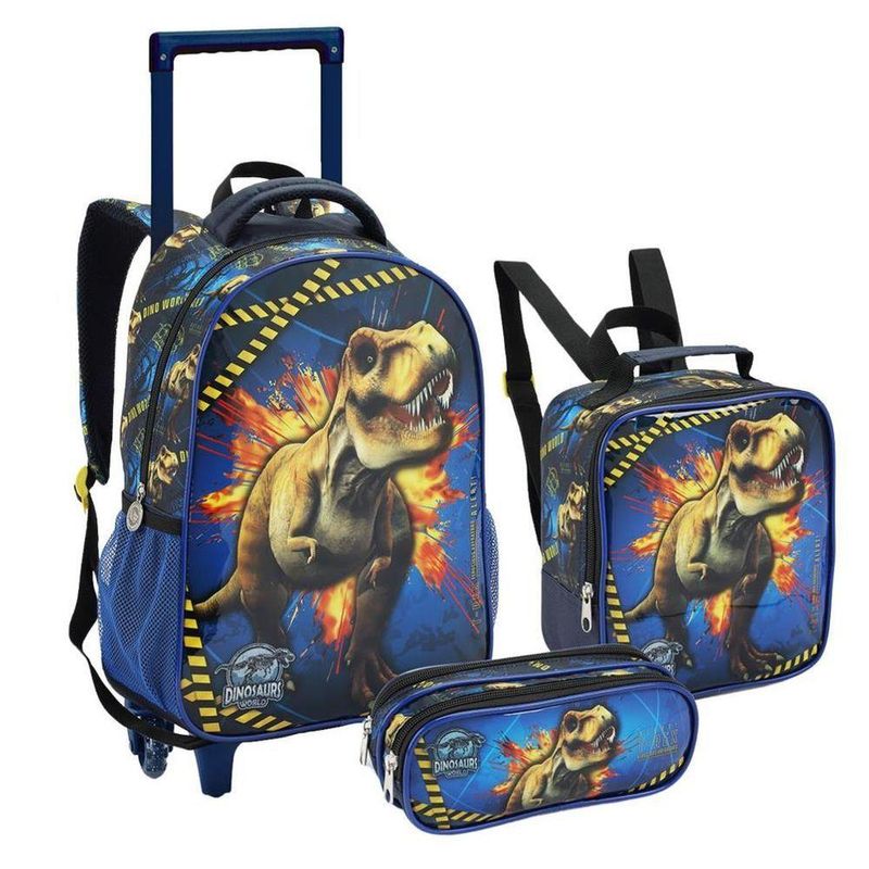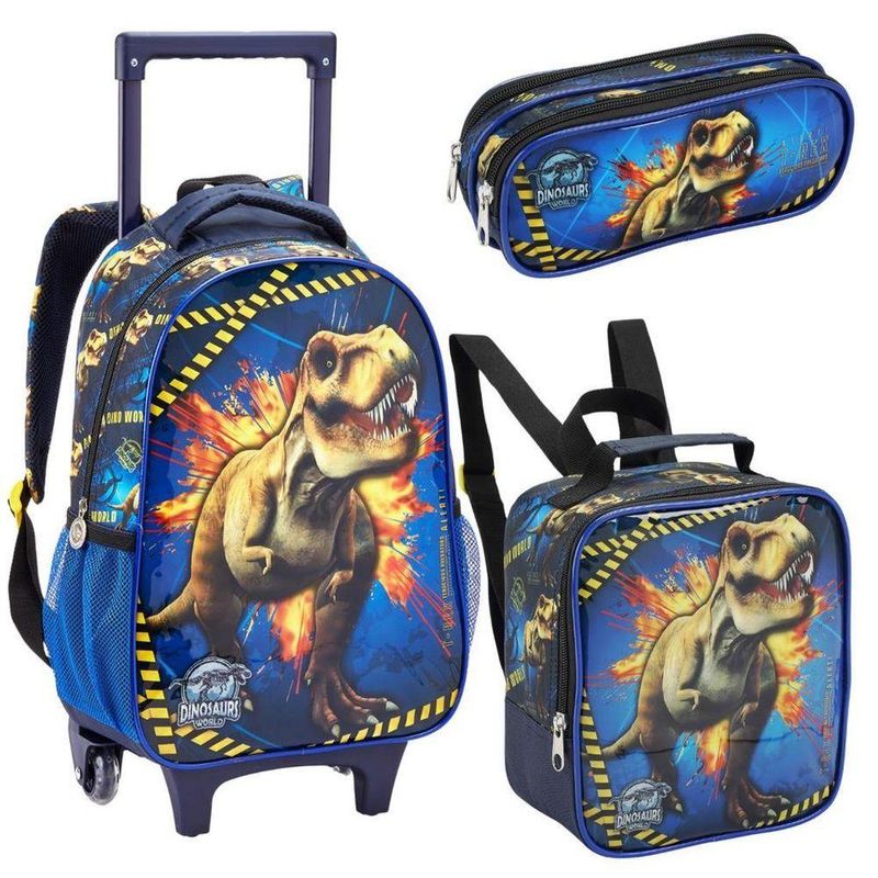 Kit Mochila Rodinhas Lancheira Estojo Infantil Escolar Menino Dinossauro Premium Azul SeaniteMochila Infantil com Rodinhas Dinossauro, dispõe de alça de mão reforçada, alça de costa acolchoada e regulável, alça retrátil para uma melhor locomoção. Sua abertura principal se da por zíper com puxador personalizado. Internamente possui amplo espaço para a guarda de diversos materiais como cadernos grandes, livros e estojos. Na parte frontal possui um compartimento menor com zíper para a guarda de pertences de menor tamanho. Confeccionada em Poliéster.Lancheira Térmica Dinossauro, dispõe de alça de mão e costas ajustáveis com sistema de alça carona para acoplar a mochilete, abertura principal por zíper com puxador personalizado. Internamente possui forro com sistema de isolamento térmico com material lavável. Confeccionada em poliéster.Estojo Duplo, possui 2 divisórias para transportar canetas, canetinhas e lápis de cor.Características da Mochila com Rodinhas:- Mochilete personalizada;- Placa de identificação na parte das costas;- Rodinhas de silicone;- Bolsos laterais com redinha.Tamanho e Peso da Mochila com Rodinhas:- Altura: 41 cm (Altura total de 77 cm incluindo o carrinho com a haste levantada)- Largura: 30 cm- Profundidade: 13 cm- Peso: 1,190 gramasLancheira:- Altura: 25 cm- Comprimento: 19 cm- Profundidade: 14 cm* NÃO ACOMPANHA GARRAFINHA E PORTA LANCHE.- Produto Certificado INMETRO: Registro 004508/2019 - OCP 0019Estojo Duplo:- Altura: 9cm- Largura: 28cm- Profundidade: 6,5cm- Produto Certificado INMETRO: Registro 004509/2019 - OCP 0019