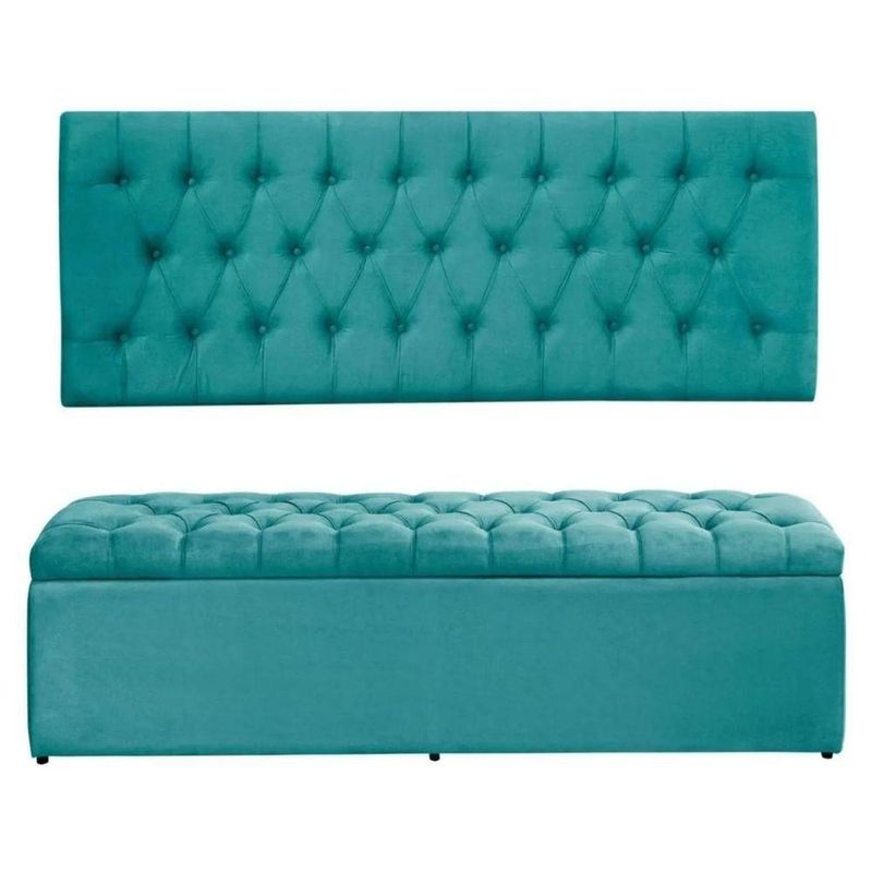Kit Painel Cabeceira Com Bau Calçadeira Dubai 1,58m Para Cama Queen Size Suede Azul Tifany - Aurora LineCabeceira Estofada - Aurora LineValorize o seu quarto com elegância com a Cabeceira Estofada! Se você está em busca de um item que traga conforto, sofisticação e um toque de modernidade para o seu ambiente, essa é a escolha perfeita.A Cabeceira Estofada é um produto de alta qualidade, feito com materiais selecionados e duráveis. Sua estrutura é produzida em madeira de pinus e eucalipto, garantindo resistência e estabilidade. Além disso, é revestida com espuma de alta densidade, proporcionando um conforto excepcional.Com um design moderno e sofisticado, a Cabeceira Estofada se adapta perfeitamente a qualquer estilo de decoração. Seja para um quarto ou para um canto alemão, ela traz beleza e elegância para o ambiente. Seu acabamento impecável e detalhes cuidadosamente pensados fazem dela um item único.Além de sua estética encantadora, a Cabeceira Estofada também é extremamente funcional. Ela oferece um suporte confortável para a cabeça e as costas, permitindo que você desfrute de momentos de relaxamento e descanso. Seja para ler um livro, assistir TV ou simplesmente relaxar, essa cabeceira é perfeita para tornar esses momentos ainda mais agradáveis.Características da Cabeceira:- Largura: 158 cm;- Altura: 60 cm;- Profundidade: 8 cm;- Produto estofado;- Produzido em Madeira de Pinus e Eucalipto.Características da Calçadeira:- Largura: 45 cm;- Altura: 44 cm;- Profundidade: 158 cm;- Produto estofado;- Produzido em Madeira de Pinus e Eucalipto.Observações:- Não acompanha kit frame para fixar no box;- Limpar com flanela limpa e seca. Não molhar o móvel e não expor em lugar úmido ou próximo de fontes de calor. Não usar produtos abrasivos;- As imagens ambientadas são meramente ilustrativas e podem apresentar itens que não compõe o produto;- Objetos decorativos que aparecem na foto não acompanham o produto;- As cores do produto podem variar de acordo com o monitor, a iluminação do ambiente, ou sua percepção visual;- Confira as dimensões antes da compra e certifique-se de que o produto passará por elevadores, portas e corredores, já que nossa entrega não inclui a subida de lances de escada, ou o lançamento de produtos;- Ao receber seus produtos, verifique no ato do recebimento qualquer dano na embalagem. Caso tenha alguma avaria, favor não assinar o comprovante de recebimento (A transportadora tem obrigação de esperar a conferência);- Produto para uso residencial em ambiente interno, não devendo ficar exposto diretamente ao sol, calor e umidades excessivas.