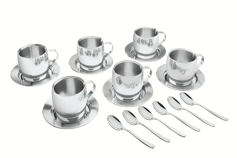 Você irá surpreender os seus convidados ou clientes com o Kit para Chá e Capuccino Tramontina em Aço Inox Acabamento Brilho com Xícara Pires e Colher 18 Peças da linha Chá e Café. Produzidas totalmente em aço inox, as peças são altamente duráveis e não soltam nenhum resíduo nas bebidas, mantendo-as próprias para consumo. Além disso, as xícaras possuem paredes duplas, ou seja, o calor da bebida não passa para a parte externa. Ideal para o uso diário, o seu acabamento em brilho irá tornar esse momento de apreciação ainda mais sofisticado e elegante.Descrição técnicaTotalmente feitas de aço inox, por isso não soltam nenhum resíduo nos alimentos, mantendo-os saudáveis. Altamente duráveis, mantêm as características originais, preservando a beleza, a higiene e a durabilidade do material. Acabamento em brilho. Próprias para o uso diário, combinam com qualquer ambiente. Versatilidade e beleza na hora de servir. As xícaras possuem paredes duplas, o calor da bebida não passa para a parte externa. Podem ser lavadas, diariamente, na máquina de lavar louças.Orientação GeralUse apenas sabão ou detergente e uma esponja macia. Outros tipos de produto como palha de aço, poderão riscar ou prejudicar o brilho das peças. Enxágue cada item a fim de remover totalmente os resíduos dos produtos de limpeza, que, por serem abrasivos, podem danificar o inox. Sempre que possível, use água quente, pois renova o brilho das peças. Após a lavagem, enxugue imediatamente as peças, caso contrário, as substâncias químicas da água (cloro) poderão causar manchas. Evite atrito entre as peças durante o processo de lavagem e no armazenamento, para mantê-las sem riscos. Evite o contato do produto com superfícies quentes, pois elas provocam a descoloração do material. Não guarde as peças em locais úmidos. A umidade também provoca manchas. Garantia do produto: 90 dias de garantia de acordo com o Código de Defesa do Consumidor + a Garantia do Fabricante