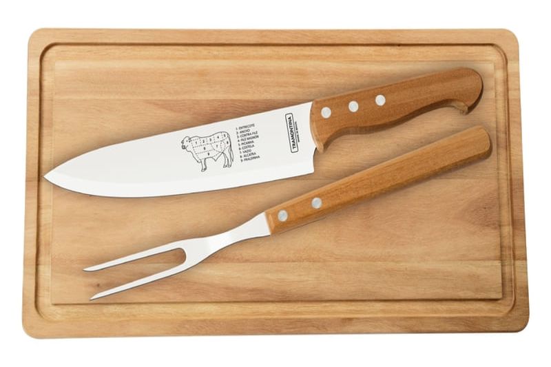 Com o Kit para Churrasco Tramontina com Lâminas em Aço Inox e Cabos de Madeira Natural 3 Peças o sucesso da reunião em família está garantido! Prático e sofisticado, ele oferece bom gosto na hora de servir as melhores carnes. São três peças: a faca de oito polegadas possui lâmina de aço inox e garante maior durabilidade do fio devido ao tratamento térmico, o garfo conta com maior espessura e uma estampagem do aço que garante maior resistência, evitando deformações. Muito confortáveis, possuem cabo de madeira natural. Além disso, o kit acompanha uma tábua de madeira perfeita para cortar e servir.Descrição técnicaLâminas de aço inox. As lâminas das facas têm maior durabilidade do fio devido ao tratamento térmico. As lâminas dos garfos conta com maior espessura e uma estampagem do aço que garante maior resistência, evitando deformações. Os cabos são de madeira natural. Rebites de alumínio.Tábua de madeira ideal para cortar e servir.Orientação GeralAntes da primeira utilização, lave bem as peças e seque-as. Tenha cuidado ao manusear produtos cortantes e perfurantes e mantenha-os fora do alcance de crianças. Para maior durabilidade dos produtos, recomenda-se secar lavar manualmente e secá-los antes de guardar.Para descarte dos produtos e embalagens siga as orientações de reciclagem vigentes. Garantia do produto: 90 dias de garantia de acordo com o Código de Defesa do Consumidor + a Garantia do Fabricante