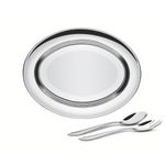 Peças totalmente feitas de aço inox, por isso não soltam nenhum resíduo nos alimentos, mantendo-os saudáveis. Altamente duráveis, mantêm suas características originais, preservando a beleza, a higiene e a durabilidade do material. Beleza e praticidade em seu design. Ideal para servir à mesa. Acabamento em brilho. Higiênicas e de fácil limpeza. Podem ser lavadas diariamente na máquina de lavar louças. Conteúdo: 01 Travessa Funda 02 Talheres para Salada Fabricante: Tramontina