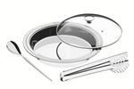 Tenha prazer em receber em receber convidados em sua casa. O Kit para Servir Tramontina Ciclo Redondo em Aço Inox 3 Peças é ideal para servir à mesa com beleza e praticidade. A tampa de vidro mantém os alimentos quentes por mais tempo sem abrir mão da elegância. As peças são totalmente feitas de aço inox, por isso não soltam nenhum resíduo nos alimentos, mantendo-os saudáveis, além de serem altamente duráveis. Tem acabamento em brilho, com detalhes em alto relevo nas bordas. A linha Ciclo é praticidade e qualidade para o seu dia a dia.Descrição técnicaPeças totalmente feitas de aço inox, por isso não soltam nenhum resíduo nos alimentos, mantendo-os saudáveis. Altamente duráveis mantêm suas características originais, preservando a beleza, a higiene e a durabilidade do material. Beleza e praticidade em seu design. Ideal para servir à mesa. Acabamento em brilho, com detalhes em alto relevo nas bordas. Com tampa de vidro mantém os alimentos quentes por mais tempo. Higiênicas e de fácil limpeza. Podem ser lavadas diariamente na máquina de lavar louças.Orientação GeralUse apenas sabão ou detergente e uma esponja macia. Outros tipos de produto como palha de aço, poderão riscar ou prejudicar o brilho das peças. Enxágue cada item a fim de remover totalmente os resíduos dos produtos de limpeza, que, por serem abrasivos, podem danificar o inox. Sempre que possível, use água quente, pois renova o brilho das peças. Após a lavagem, enxugue imediatamente as peças, caso contrário, as substâncias químicas da água (cloro) poderão causar manchas. Evite atrito entre as peças durante o processo de lavagem e no armazenamento, para mantê-las sem riscos. Evite o contato do produto com superfícies quentes, pois elas provocam a descoloração do material. Não guarde as peças em locais úmidos. A umidade também provoca manchas. Garantia do produto: 90 dias de garantia de acordo com o Código de Defesa do Consumidor + a Garantia do Fabricante