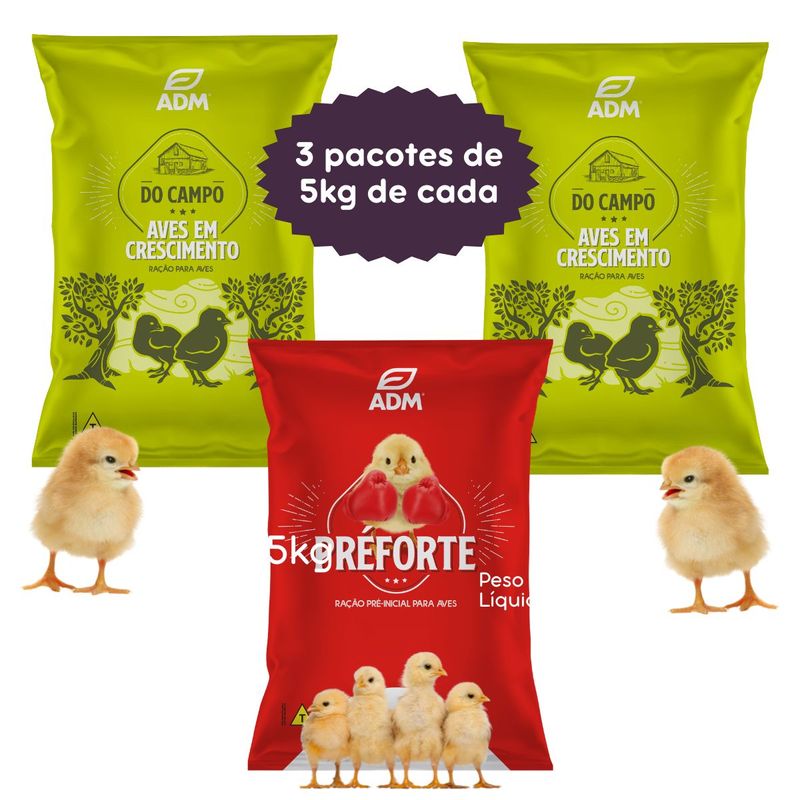 Kit Ração ADM Preforte Pré-Inicial + 02 un DO CAMPO Crescimento (5kg + 2x5 kg)Revendedor Autorizado ADM O Kit ADM Préforte + 2 un Do Campo Aves em Crescimento foi desenvolvido para garantir nutrição contínua e estratégica desde os primeiros dias de vida até a fase de crescimento, proporcionando arranque inicial forte, desenvolvimento intestinal adequado, crescimento uniforme e melhor desempenho zootécnico. É a solução ideal para criadores que buscam padronização nutricional, praticidade no manejo e segurança técnica, utilizando duas rações completas e balanceadas, formuladas por um dos maiores grupos globais em nutrição animal. O kit é composto por 01 Ração ADM PRÉFORTE – Pré-Inicial para Aves com 5 kg e 02 Ração ADM DO CAMPO – Aves em Crescimento com 5 kg. A ração PRÉFORTE é indicada para frangos de corte na fase pré-inicial e aves de reposição do 1º ao 21º dia de vida. Trata-se de um alimento completo, pronto para uso, altamente nutritivo, formulado para promover arranque inicial forte, melhor desenvolvimento intestinal, melhor aproveitamento dos nutrientes e suporte ao sistema imunológico. Sua composição inclui alto teor proteico, aminoácidos essenciais como lisina, metionina e treonina, vitaminas, minerais orgânicos, enzimas, probióticos e aditivos funcionais. A ração DO CAMPO Aves em Crescimento é indicada para pintinhos e aves em geral nas fases inicial e de crescimento. Pode ser utilizada em pintainhas de postura do 1º dia até a 18ª semana de idade ou até o início da postura, e em pintinhos de corte do 1º dia até aproximadamente 28 dias. Neste kit, sua indicação é para uso após a PREFORTE. Foi formulada para atender às exigências nutricionais dessa fase, promovendo crescimento equilibrado, boa conversão alimentar e desenvolvimento corporal adequado. Os produtos são prontos para uso e indicados tanto para pequenos criadores quanto para sistemas produtivos mais tecnificados. Marca: ADM.Linhas: Préforte e Do Campo.Categoria: ração completa para aves.Peso total do kit: 15 kg.Indústria brasileira. Produtos isentos de registro no Ministério da Agricultura e Pecuária, conforme legislação vigente. Conservar em local seco e arejado, sobre estrados, afastado de paredes, na embalagem original e longe de produtos tóxicos. A ADM - Archer Daniels Midland é uma das maiores empresas globais de nutrição humana e animal, com mais de um século de atuação. No Brasil, atua por meio de sua divisão de nutrição animal, incorporando a expertise da Neovia, referência mundial em ciência, inovação e tecnologia em alimentação animal.