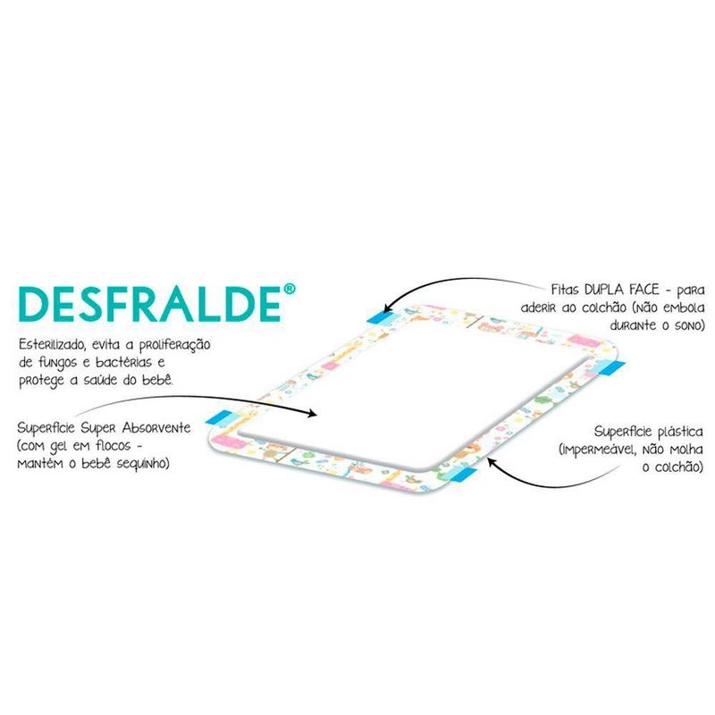 Kit Protetor de Colchão Desfralde Absorvente 5 Pacotes 50 Un Indicado para proteger o colchão, o Protetor Desfralde é descartável e absorvente. É próprio para proteger contra vazamentos de fraldas no dia a dia. Esterilizado, evita a proliferação de fungos e bactérias e ainda protege a saúde do bebê. Sua superfície é absorvente com gel em flocos que mantem o bebê sequinho. Possui fitas dupla face para aderir aos locais que quer proteger, e superfície plástica impermeável que não mancha o local. Super fácil de usar! • Características Recomendado para crianças até os 7 anos ou até fazerem xixi na cama Evita a proliferação de fungos e bactérias Esterilizado Protege a saúde do bebê Superfície absorvente com gel em flocos Mantém o bebê sequinho Fitas dupla face Superfície plástica Dimensões: 70 x 60 cm • Dados Técnicos Conteúdo da embalagem: 5 pacotes com 50 Unidades de Protetores Garantia: defeito de fabricação