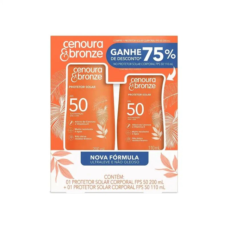 O Kit Protetor Solar Cenoura & Bronze FPS 50 oferece alta proteção solar com fórmulas modernas, ultraleves e de rápida absorção, ideais para uso diário e dias intensos de sol. Composto por dois protetores solares corporais (200 mL + 110 mL), o kit garante proteção eficaz contra os raios UVA + UVB, além de hidratação com toque seco e sem resíduos brancos. A fórmula conta com os ativos de cenoura e vitamina E, que ajudam a prevenir os sinais do tempo, mantendo a pele saudável e protegida. Ideal para quem busca praticidade e eficiência com benefícios prolongados.Benefícios:• Alta proteção solar FPS 50 contra os raios UVA + UVB.• Textura leve, toque seco e rápida absorção.• Não oleoso e sem resíduo branco.• Muito resistente à água e ao suor.• Hidrata enquanto protege, com ativos antioxidantes.• Dermatologicamente testado.Ativos:• Extrato de Cenoura – Rico em betacaroteno, estimula a produção natural de melanina e ajuda a manter a pele com aparência saudável.• Vitamina E – Antioxidante potente que combate os radicais livres e previne o envelhecimento precoce.Modo de uso:• Aplique o protetor solar uniformemente sobre a pele seca antes da exposição ao sol.• Reaplique a cada duas horas ou após mergulho, transpiração excessiva ou uso de toalha.• Uso diário recomendado para melhor proteção e prevenção dos danos causados pelo sol.Precauções:• Uso externo.• Evite contato com os olhos.• Não aplicar sobre a pele irritada ou lesionada.• Mantenha fora do alcance de crianças.• Reaplicar sempre para manter a eficácia da proteção solar.Sobre a Marca: Com mais de 40 anos de tradição no cuidado com a pele exposta ao sol, Cenoura & Bronze oferece produtos que unem tecnologia, eficácia e respeito à natureza. Todos os itens da marca são veganos, livres de crueldade animal e aprovados pelo programa Leaping Bunny, com o selo Cruelty Free. A linha completa inclui protetores, bronzeadores e loções desenvolvidas para proteger, hidratar e valorizar sua beleza natural todos os dias.Contém: - 1 Protetor solar corporal de 200g- 1 Protetor solar corporal de 110g