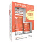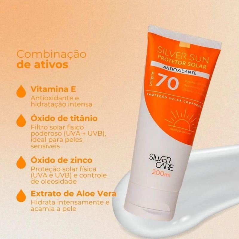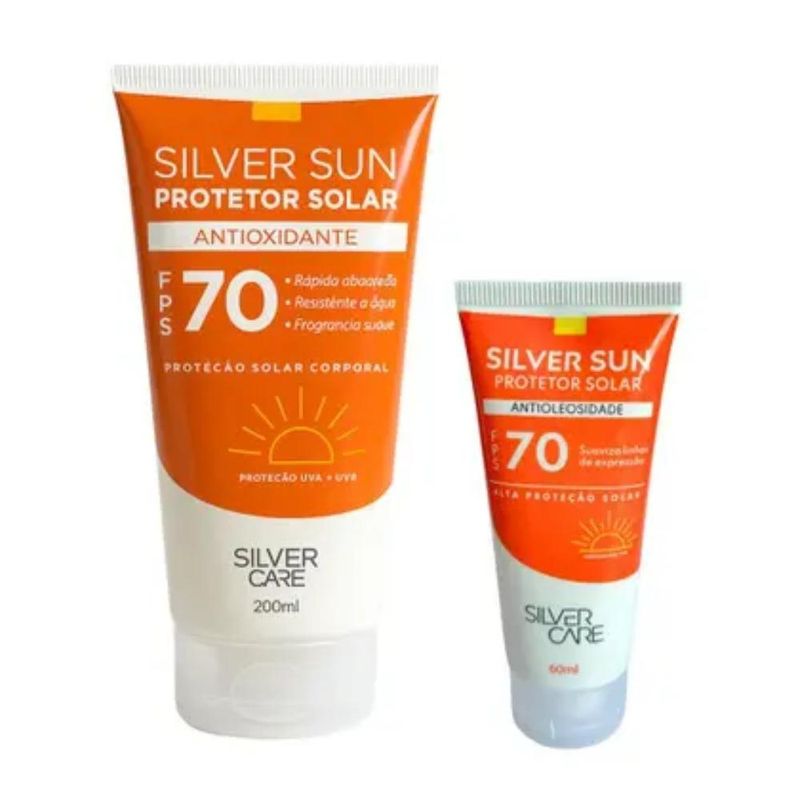 Kit Protetor Solar Silver Sun FPS 70 Silver Care O kit contém: 1 Protetor Solar Facial Antioleosidade FPS 70 60 ml 1 Protetor Solar Corporal FPS 70 200 ml O Kit Protetor Solar combina o Protetor Solar Facial Antioleosidade FPS 70 com o Protetor Solar Corporal FPS 70, oferecendo proteção solar completa para rosto e corpo. Desenvolvido com fórmula de alta performance, este kit protege intensamente contra os raios UVA e UVB, hidrata e cuida da pele durante todo o dia — ideal para uso diário ou durante atividades ao ar livre. Benefícios: - Alta proteção solar contra raios UVA e UVB. - Ajuda a prevenir danos e envelhecimento precoce da pele. - Hidratação intensa e pele mais suave e flexível. - Ação antioxidante com vitamina E (facial) para neutralizar radicais livres. - Filtros físicos como óxido de titânio e zinco reforçam a proteção (facial). - Aloe vera acalma e refresca a pele após a exposição solar. Indicação: Indicado para todos os tipos de pele, inclusive as mais sensíveis. Ideal para rotinas diárias de proteção solar, praia, piscina e esportes ao ar livre. Modo de usar: Aplique uma quantidade generosa do protetor solar nas áreas expostas da pele antes da exposição ao sol. Reaplique sempre que necessário, especialmente após nadar, suar excessivamente ou se secar com toalha. Especificações: Apresentação: Kit Fator de Proteção Solar: 70 Formato: Creme