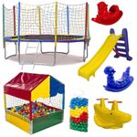 Kit Pula Pula 3,05m + Piscina De Bolinhas 1m + 500 Bolinhas + Escorrega Médio + 2 Gangorra 1l + 1 G2KIT PLAYGROUND – CAMA ELÁSTICA + PISCINA DE BOLINHAS + 500 BOLINHAS + ESCORREGADOR MÉDIO + 2 GANGORRAS 1 LUGAR + 1 GANGORRA 2 LUGARES!CAMA ELÁSTICA REDONDAMEDIDAS (VALORES APROXIMADOS):- Diâmetro total: 3,05m- Diâmetro lona de salto (gancho a gancho): 2,60m- Altura total: 1,90m- Altura do chão a lona: 60cmESPECIFICAÇÕES:- Estrutura em aço galvanizado;- Sistema de impulsão por 64 molas;- Rede de proteção em polipropileno multicolorida;- Sistema de montagem do trampolim por encaixe (fácil de montar);- Suporta até 150 kg;- Lona de salto; (A cor varia de acordo com a disponibilidade do estoque, não é possível escolher a cor da lona);- Protetor de Molas;- Acompanha escada;Piscina de Bolinhas:- Estrutura em aço galvanizado;- Acessórios com proteção UV;- Rede de proteção em polipropileno multicolorida;- Sistema de montagem por encaixe (fácil de montar);- Revestida com isotubos blindados.Escorregador Médio:- Fabricado com material atóxico;- Suporta até 30kg;- Escada com 3 degraus;- Encaixe para Piscina de Bolinhas.2 Gangorras 1 Lugar:- Vários modelos, Cavalinho, Nhoca (VERIFICAR DISPONIBILIDADE);- Fabricada com material atóxico.1 Gangorra Jacaré 2 Lugares- Fabricada com material atóxico.Bolinhas produzidas com materiais de alta resistência e qualidade (proporcionam uma brincadeira alegre e sem riscos), além de atóxico (não prejudicam a saúde da criança e proporcionam maior higiene). Sistema anti quebra (você não perde bolinhas quebradas, e não machuca as crianças).Bolinhas com sistema emborrachado (a bolinha não amassa, você aperta e ela volta na hora).As bolinhas são enviadas em cores e aleatórias, de acordo com a disponibilidade do estoque.Diâmetro: 71 mmImagem meramente ilustrativa.- GARANTIA DE : 90 DIAS!- IMAGEM MERAMENTE ILUSTRATIVA, A COR VARIA DE ACORDO COM DISPONIBILIDADE EM ESTOQUE.
