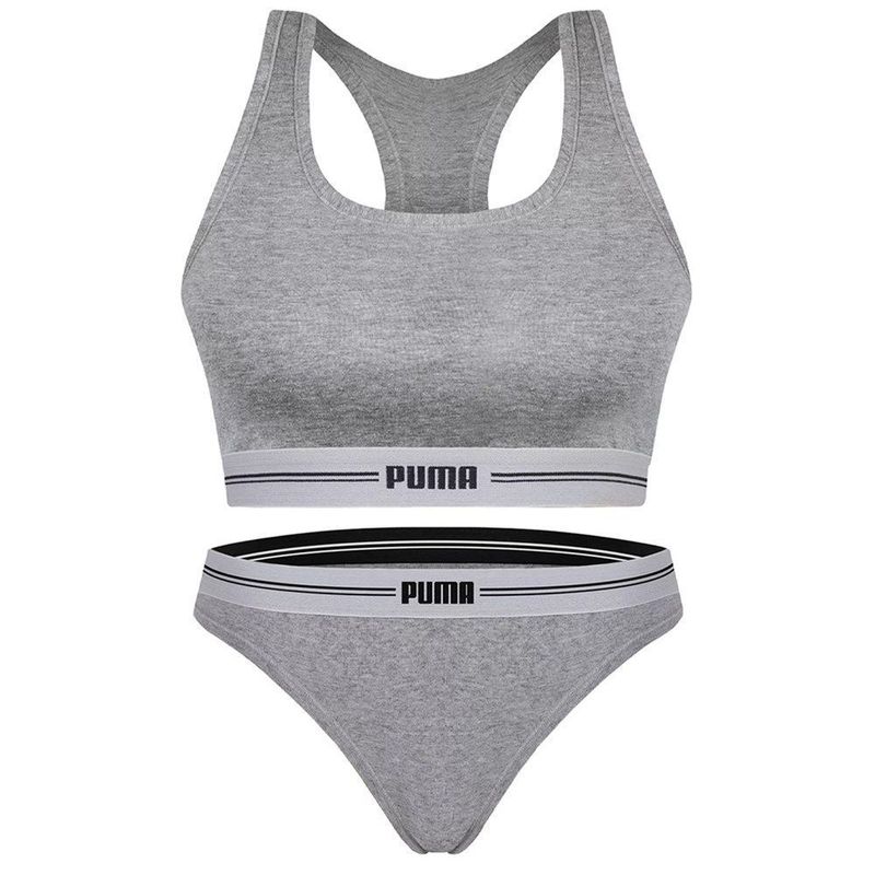 Descrição:Exercite-se com mais desempenho e aumente seu estilo esportivo. O top é confeccionado em algodão, poliéster e elastano, o que permite que você obtenha sensação suave, leveza e elasticidade durante seus exercícios. As costas no estilo nadador oferecem mais frescor e mais liberdade para seus movimentos. A barra elástica se ajusta ao seu corpo, oferecendo mais segurança. Não possui bojo. Perfeita para adicionar conforto ao seu uso diário, a Calcinha Puma Biquíni ainda oferece muito estilo. Confeccionada em algodão, poliéster e elastano, a peça propicia sensação de maciez e elasticidade. Sua modelagem biquíni e o cós elástico permitem melhor ajuste ao corpo. Conta com fundo também em algodão. Medidas aproximadas do Top (cm): P: 28x26 / M: 30x28 / G: 32x30 / EG: 34x32 (Largura x Comprimento). Medidas aproximadas da calcinha (cm): P: 36x20,5 / M: 38x22,5 / G: 40x24,5 / EG: 42x26,5 (Largura x Comprimento). INFORMAÇÕES Referência: 36897/36898 Composição: 84% algodão, 11% poliéster e 05% elastano. Gênero: Feminino Indicado: Dia a dia