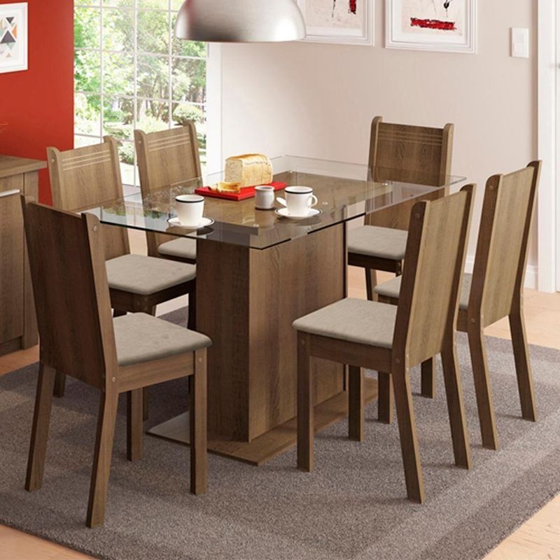 Kit Sala de Jantar Gales Rustic Mesa com 6 Cadeiras MadesaO Conjunto de Jantar Gales une beleza e materiais nobres.Características:- Contempla 6 lugares- Possui design moderno e cores neutras, combinando em qualquer decoração.- A mesa de jantar retangular é tradicional e oferece mais espaço e maior conforto.- O tampo de vidro enobrece o produto e fica perfeito em qualquer ambiente: cozinha, sala de estar ou sala de jantar.Especificações Técnicas:- Marca: Madesa - Referência: 044775ZXTPER- Cor: Rustic- Itens Inclusos: 1 mesa retangular com estrutura em MDP e tampo de vidro e 6 cadeiras com estrutura em MDF- Dimensões da Mesa (LxAxP): 160 cm x 77 cm x 90 cm- Dimensões das Cadeiras (LxAxP): 37 cm x 89 cm x 44 cm- Dimensões da Embalagem (LxAxP): 90 cm x 53 cm x 160 cm- Peso da Embalagem: 77,6 kgGarantia: 3 meses