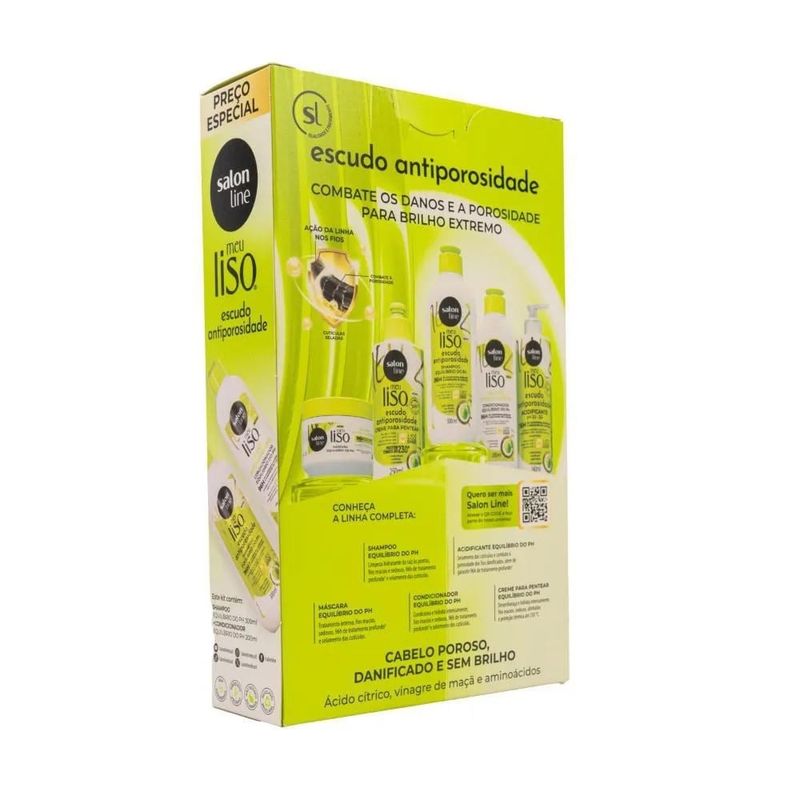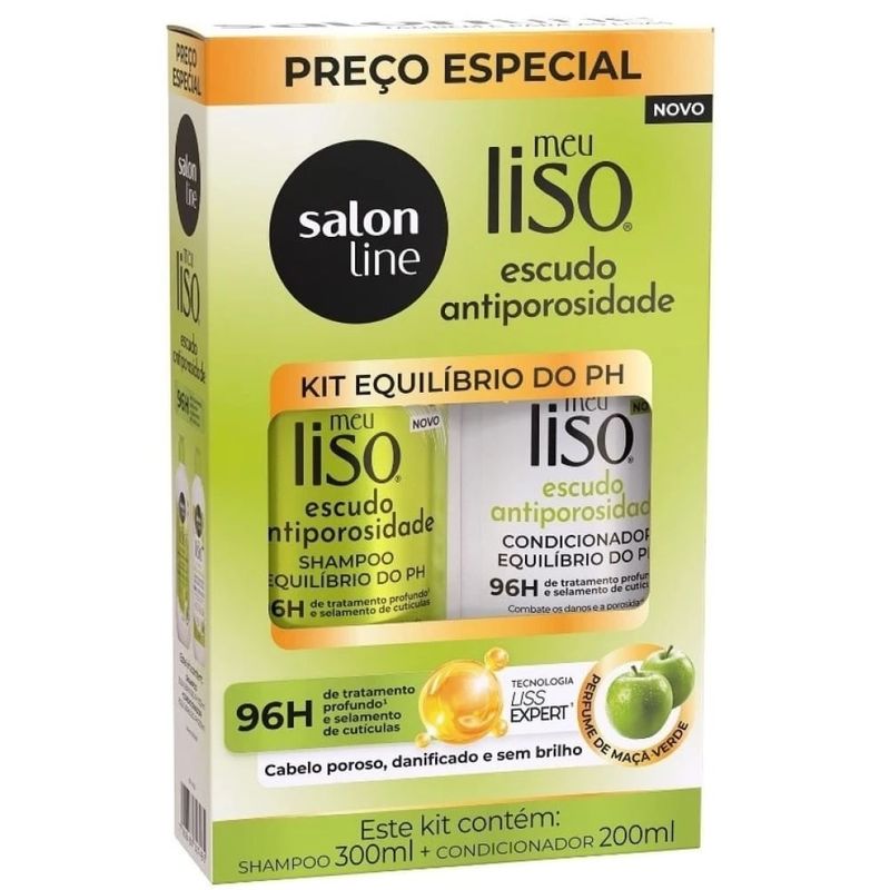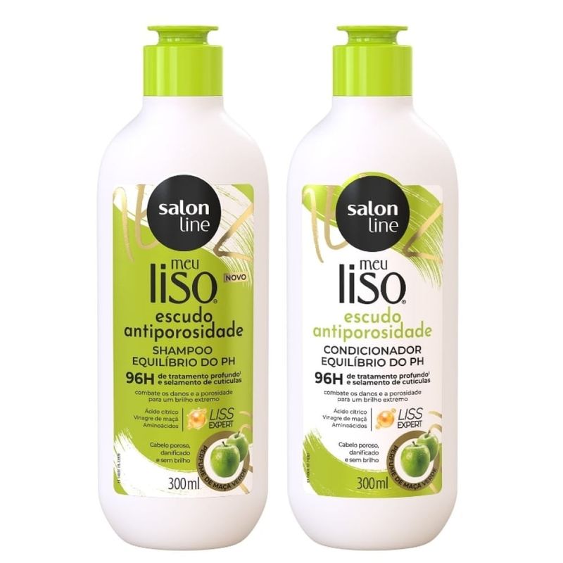 Kit Salon Line Meu Liso Escudo Antiporosidade Shampoo 300ml + Condicionador 200mlProteção máxima contra a porosidade para fios lisos e alinhados! O Kit Salon Line Meu Liso Escudo Antiporosidade proporciona limpeza eficaz, hidratação intensa e selamento das cutículas, garantindo até 96h de tratamento profundo. Ideal para cabelos porosos, danificados e sem brilho — devolve maciez, brilho espelhado e proteção contra agressões externas.O kit contém Shampoo 300ml e Condicionador 200ml, formulados para promover equilíbrio do pH, nutrição profunda e selamento das cutículas. Resultado: fios mais sedosos, com menos frizz, porosidade reduzida e brilho imediato.IndicaçõesTipos de cabelo: liso e ondulado;Indicação: cabelos porosos, danificados e sem brilho;Idade recomendada: a partir de 12 anos.AçãoFórmula de ação intensa e rápida que oferece nutrição, restauração e proteção prolongada. Trabalha no selamento das cutículas para reduzir porosidade e manter o tratamento por até 96 horas.Conselho de AplicaçãoShampoo: Aplique no cabelo úmido, massageie suavemente e enxágue. Repetir se necessário.Condicionador: Após o shampoo, aplique no comprimento e pontas, massageie e deixe agir de 1 a 3 minutos. Enxágue completamente.ResultadoHidratação intensa e restauração dos fios;Selamento das cutículas e redução da porosidade por até 96 horas;Brilho espelhado, toque sedoso e fios alinhados;Proteção contra agressões externas e controle do frizz.Composição / AtivosFórmula com blend de aminoácidos, agentes hidratantes e seladores que reconstroem, nutrem e protegem a fibra capilar. (Consultar rótulo para lista completa de ingredientes).Conteúdo da Embalagem01 unidade Shampoo Meu Liso Escudo Antiporosidade 300ml01 unidade Condicionador Meu Liso Escudo Antiporosidade 200mlModo de ConservaçãoConservar em local seco e fresco, protegido da luz solar direta;Manter fora do alcance de crianças;Evitar contato com os olhos; em caso de contato, enxaguar com água abundante.PrecauçõesUso externo;Em caso de irritação ou reação alérgica, suspenda o uso e procure orientação médica;Não ingerir.