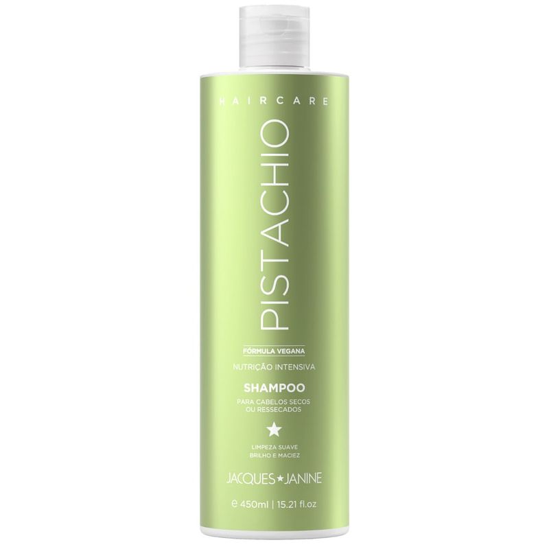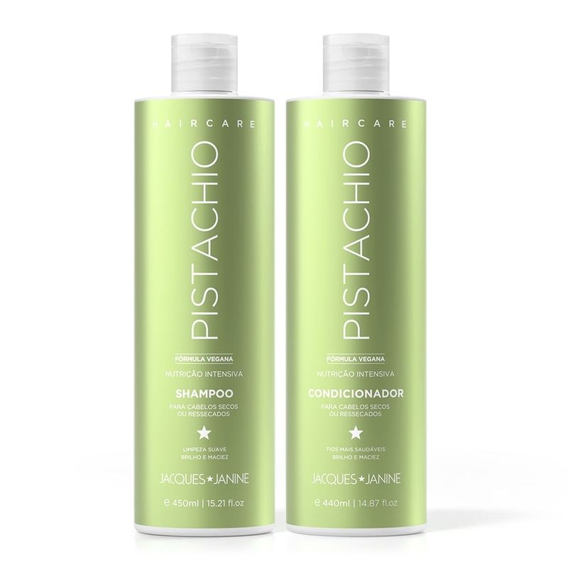 Kit Shampoo Jacques Janine Haircare Pistachio 450ml + Condicionador 440mlO que é e para que serveO Kit Jacques Janine Haircare Pistachio foi desenvolvido para quem busca cabelos nutridos, macios e com brilho natural todos os dias.Composto por Shampoo (450ml) e Condicionador (440ml), esse duo une tecnologia profissional e o poder nutritivo do pistache, ingrediente rico em vitaminas e antioxidantes que revitaliza os fios da raiz às pontas, deixando-os mais fortes e saudáveis.Ideal para todos os tipos de cabelo, o kit limpa suavemente, hidrata e devolve a vitalidade, proporcionando uma experiência de cuidado completa e luxuosa digna de salão.Benefícios e diferenciaisNutrição profunda com extrato de pistache, que restaura o brilho e a vitalidade dos fios;Cabelos mais macios, sedosos e fáceis de pentear desde a primeira aplicação;Fórmula vegana e dermatologicamente testada, livre de parabenos e corantes;Limpeza suave que não agride o couro cabeludo;Ação reparadora e fortalecedora, ideal para fios secos, danificados ou sem vida;Fragrância envolvente e sofisticada, que perfuma o cabelo de forma duradoura;Uso diário, com textura leve e resultados visíveis desde a primeira lavagem.Como usarAplique o Shampoo Jacques Janine Pistachio sobre os cabelos molhados e massageie o couro cabeludo até formar espuma.Enxágue bem e repita a aplicação se necessário.Em seguida, aplique o Condicionador Jacques Janine Pistachio do comprimento às pontas, massageando suavemente.Deixe agir por alguns minutos e enxágue abundantemente.Para resultados ainda mais intensos, utilize em conjunto com a Máscara Capilar Jacques Janine Pistachio.PrecauçõesUso externo.Mantenha fora do alcance das crianças.Evite contato com os olhos.Em caso de irritação, suspenda o uso e procure orientação médica.Conservar em local fresco, seco e protegido da luz solar direta.