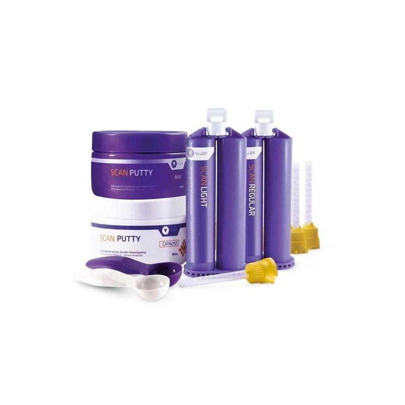Características ► Silicone de Adição Kit Scan Putty + Scan Light + Scan Regular Yller (Putty 600ml + Light 50ml + Regular 50ml). Indicações ► Indicado para restaurações indiretas, arcadas edêntulas, implantes e seus componentes, enceramento diagnóstico e modelos de estudos, restaurações temporárias e definitivas; ► Cores vivas e com alto contraste, facilitando a avaliação da moldagem; ► Versão fluida em uma prática embalagem de automistura; ► Excelente estabilidade dimensional; ► Elevada resistência ao rasgamento; ► Permite a confecção de múltiplos modelos; ► Dosadores resistentes e anatômicos; ► Elevada capacidade de cópia; ► Putty: Cor Violeta, confortável tempo de trabalho/presa intraoral, reduzida dureza final, facilidade na remoção da moldagem; ► Light: Cor amarela, elevada fluidez, confortável tempo de trabalho/presa intraoral. Itens inclusos ► 1 base 300ml; ► 1 catalisador 300ml; ► 1 Scan Light 50ml; ► 6 ponteiras misturadoras; ► 1 Scan Regular 50ml. Validade ► 2 anos a partir da data de fabricação. Garantia ► Contra defeitos de fabricação. ► Registro na ANVISA: 81009350002.
