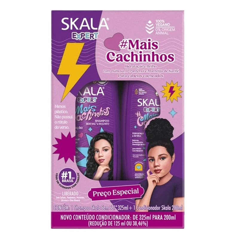 Kit Skala Mais Cachinhos Shampoo 325ml + Condicionador 200ml O que é o Kit Skala Mais Cachinhos? O Kit Skala Expert #Mais Cachinhos foi desenvolvido especialmente para trazer hidratação, maciez e brilho para crianças com cabelos cacheados. Sua fórmula delicada combina ativos suaves que tratam os fios sem agredir, eliminam o frizz, dão vida aos cachos e deixam o cabelo fácil de desembaraçar. Indicado para crianças a partir dos 3 anos de idade, oferece volume na medida certa e definição sem resíduos. Benefícios do Kit Skala Mais Cachinhos Hidratação suave, ideal para uso infantil; Cachos macios, definidos e com brilho natural; Fórmula que elimina o frizz e revitaliza os fios; Ajuda no desembaraço, facilitando a rotina; Volume equilibrado, com leveza e movimento; Indicado para crianças a partir dos 3 anos; Linha dermatologicamente desenvolvida para cuidados delicados. Modo de usar Shampoo: com os cabelos úmidos, aplique o shampoo e massageie suavemente o couro cabeludo. Enxágue bem e repita se necessário. Condicionador: aplique uniformemente sobre o cabelo limpo e úmido. Deixe agir de 1 a 3 minutos e enxágue. Finalize como desejar. Composição – Shampoo INGREDIENTES SHAMPOO: Aqua, Sodium Methyl 2-Sulfolaurate (and) Disodium 2-Sulfolaurate (and) Cetyl Betaine (and) Lauryl Betaine (and) Lauramidopropyl Betaine (and) Myristamidopropyl Betaine (and) Lauryl Lactyl Lactate (and) Dimethyl Lauramide/Myristamide, Cocamidopropyl Betaine, Polyquaternium-10, Guar Hydroxypropyltrimonium Chloride, PEG-160 Sorbitan Triisostearate, Parfum, Panthenol, Shea Butter Cetyl Esters, Aloe Barbadensis Extract, Methylchloroisothiazolinone (and) Methylisothiazolinone, Citric Acid, Disodium EDTA, Limonene.*Sem adição de Cloreto de Sódio. Composição – Condicionador INGREDIENTES CONDICIONADOR: Aqua, Cetearyl Alcohol, Cetrimonium Chloride, Shea Butter Cetyl Esters, Parfum, PEG-90M, Panthenol, Aloe Barbadensis Extract, Methylchloroisothiazolinone (and) Methylisothiazolinone, Citric Acid, Disodium EDTA, Limonene. Advertências Uso externo; Indicado para crianças a partir de 3 anos; Evitar contato com os olhos. Em caso de contato, enxaguar abundantemente; Suspender o uso em caso de irritação; Mantenha fora do alcance de crianças.