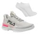 Descrição:O Kit Tênis Fila Split + Par de Meia é ideal para quem busca mais conforto e segurança na hora dos treinos. Este tênis traz um cabedal em tecido de mesh altamente respirável, aumentando ainda mais a sensação de bem-estar durante o uso. Ele conta com palmilhas em EVA e o fechamento por cadarço, que proporcionam um ajuste perfeito aos pés. Em seu calcanhar ele traz uma estrutura que oferece mais suporte aumentando sua estabilidade durante os exercícios. Por fim, sua entressola é interligada ao solado e ambos são produzidos em EVA que garante mais leveza e muito mais responsividade em cada passada. Por fim, a meia modelo sapatilha, possui reforço no calcanhar e ponta, proporcionando maior segurança durante as passadas. De design branco básico, é fácil compor looks com esta peça. Confeccionada em algodão e poliamida, prolonga a sensação de conforto durante o uso. O tamanho da meia vai variar de acordo com a numeração do tênis. Referência: F01AT00064.