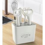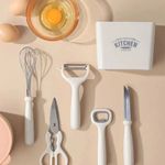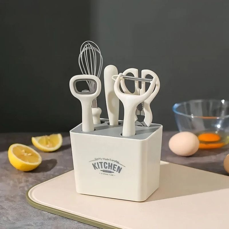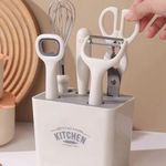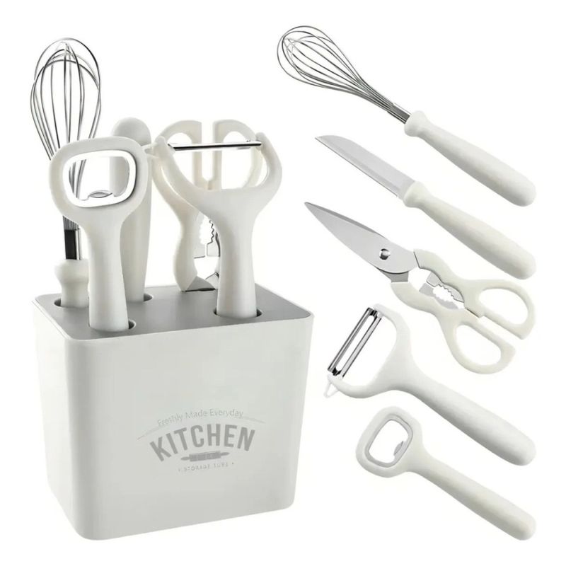 Kit Utensílios Cozinha Conjunto 6 Peças com Suporte Organizador BrancoConjunto multifuncional com 6 peças essenciais para preparo e serviço de alimentos.Estrutura em aço inoxidável e plástico de alta durabilidade para resistência prolongada.Design com cabos ergonômicos na cor branca para manuseio seguro e confortável.Inclui suporte organizador compacto para otimização de espaço na bancada da cozinha.Utensílios versáteis que incluem batedor de ovos, tesoura multiuso e descascador. O Kit de Utensílios de Cozinha com Suporte Organizador é composto por 6 peças projetadas para oferecer funcionalidade e organização no dia a dia. Fabricado com materiais de alta qualidade, como aço inoxidável e polipropileno resistente, o conjunto garante durabilidade e eficiência no preparo de diversas receitas. O kit inclui ferramentas indispensáveis: uma tesoura multiuso ideal para cortes precisos, um batedor de claras (fouet) reforçado, um descascador de legumes eficiente, uma faca versátil e um abridor de garrafas ergonômico. Todas as peças são acompanhadas por uma base plástica compacta, que mantém os utensílios sempre à mão e organizados, ocupando pouco espaço na bancada. Com acabamento na cor branca (off-white), o conjunto apresenta um design moderno que se adapta a diferentes estilos de decoração de cozinha. Especificações TécnicasMaterial: Aço inoxidável e Plástico (Polipropileno)Quantidade de peças: 6 unidadesItens inclusos: 1 Tesoura, 1 Batedor de Ovos, 1 Descascador, 1 Faca, 1 Abridor de Garrafas e 1 Base SuporteCor: Branco / Off-WhiteUso: Preparo e serviço de alimentosSuporte incluso: Sim Conteúdo da Embalagem1 Tesoura Multiuso1 Batedor de Ovos (Fouet)1 Descascador de Legumes e Frutas1 Faca de Cozinha1 Abridor de Garrafas1 Base de Suporte Organizadora