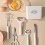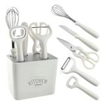 Kit Utensílios Cozinha Conjunto 6 Peças com Suporte Organizador BrancoConjunto multifuncional com 6 peças essenciais para preparo e serviço de alimentos.Estrutura em aço inoxidável e plástico de alta durabilidade para resistência prolongada.Design com cabos ergonômicos na cor branca para manuseio seguro e confortável.Inclui suporte organizador compacto para otimização de espaço na bancada da cozinha.Utensílios versáteis que incluem batedor de ovos, tesoura multiuso e descascador. O Kit de Utensílios de Cozinha com Suporte Organizador é composto por 6 peças projetadas para oferecer funcionalidade e organização no dia a dia. Fabricado com materiais de alta qualidade, como aço inoxidável e polipropileno resistente, o conjunto garante durabilidade e eficiência no preparo de diversas receitas. O kit inclui ferramentas indispensáveis: uma tesoura multiuso ideal para cortes precisos, um batedor de claras (fouet) reforçado, um descascador de legumes eficiente, uma faca versátil e um abridor de garrafas ergonômico. Todas as peças são acompanhadas por uma base plástica compacta, que mantém os utensílios sempre à mão e organizados, ocupando pouco espaço na bancada. Com acabamento na cor branca (off-white), o conjunto apresenta um design moderno que se adapta a diferentes estilos de decoração de cozinha. Especificações TécnicasMaterial: Aço inoxidável e Plástico (Polipropileno)Quantidade de peças: 6 unidadesItens inclusos: 1 Tesoura, 1 Batedor de Ovos, 1 Descascador, 1 Faca, 1 Abridor de Garrafas e 1 Base SuporteCor: Branco / Off-WhiteUso: Preparo e serviço de alimentosSuporte incluso: Sim Conteúdo da Embalagem1 Tesoura Multiuso1 Batedor de Ovos (Fouet)1 Descascador de Legumes e Frutas1 Faca de Cozinha1 Abridor de Garrafas1 Base de Suporte Organizadora