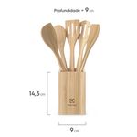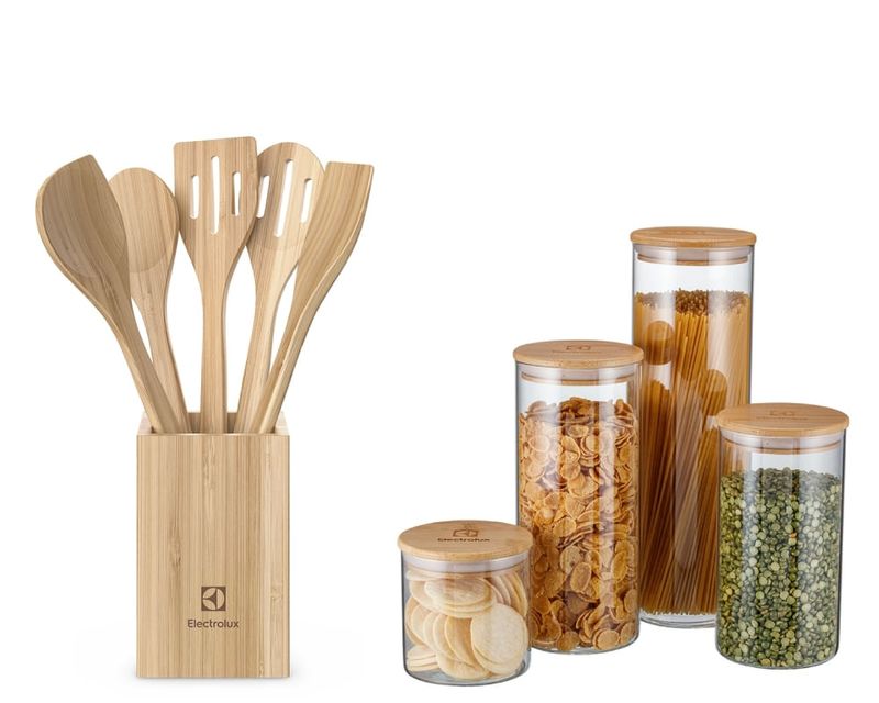 Conjunto de Utensílios de Bambu Toda a beleza dos itens de bambu para deixar a sua cozinha ainda mais prática, organizada e cheia de charme! Perfeitos para todos os momentos. Do preparo até a hora de servir. Peças feitas de bambu, material sustentável e altamente resistente. Tendência em design, contém agentes bactericidas naturais que previnem o aparecimento de bactérias e maus odores. O conjunto traz 5 utensílios diferentes e 1 suporte para facilitar o preparo de diversos pratos e receitas. Os Potes Herméticos Porta-Mantimentos com Tampa de Bambu Electrolux contam com vedação hermética com anel de silicone, o que garante selagem perfeita que ajuda a manter o sabor e as texturas originais. Ideais para armazenar temperos, sementes, farinhas, cereais, grãos, café, macarrão, biscoito, doces, torradas e outros alimentos secos.